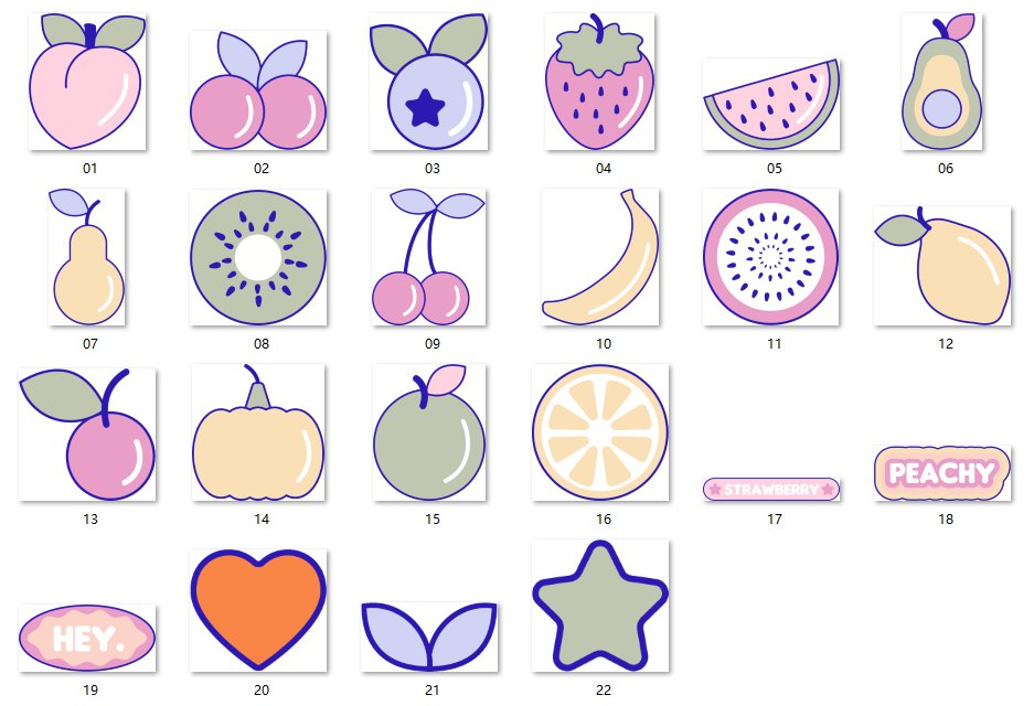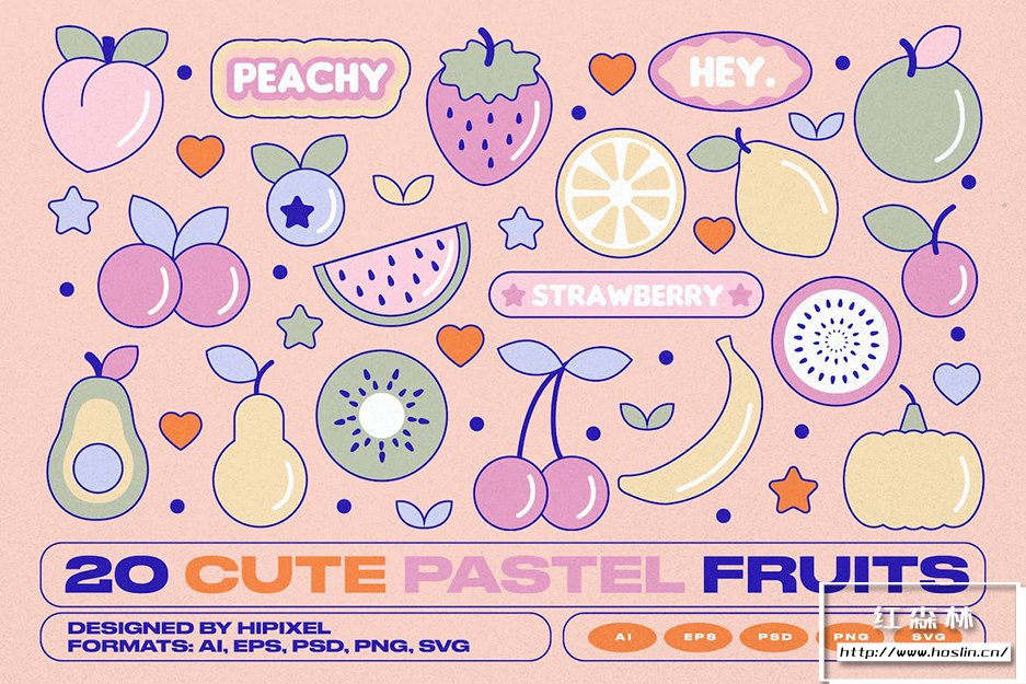 20 张可爱的柔和水果贴纸,适合广告、包装、拼贴艺术、剪贴簿、贴纸、海报、明信片和所有创意设计。由于矢量形状和组织良好的图层,所有元素都很容易编辑、自定义和调整大小。EE-T2TCKWP