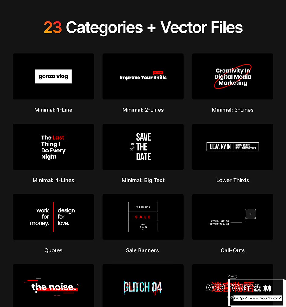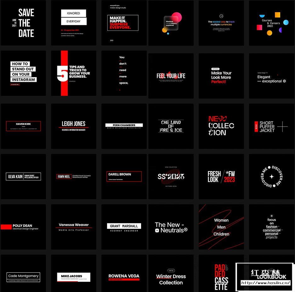 3、颜色、时尚、运动、电影、倒计时、跺脚、版式细节、相机取景器、背景- 是我们最新更新 V3 中的新类别!使用时尚类别推广您的服装品牌或造型手册。使用体育模板运行体育频道。制作带有电影标题的专业电影或预告片。在我们新的倒计时类别中使用定制的仪表、计时器和时钟。使用Stomps创建一个由字符、单词或线条动画的动态标题。使用版式细节类别为您的设计增添趣味。使用新的相机取景器添加拍摄效果。最后是背景– 不同的渐变和形状,分为浅色、深色和有色。现在您可以在工作的任何领域使用这些动画模板并创建前所未有的杰作!