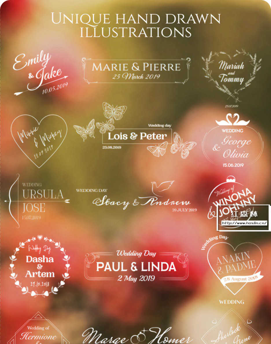 这 50 个华丽而有品位的婚礼标题中的每一个都是由我们的专业团队设计和制作的。婚礼摄像师和摄影师的完美系列!手绘且完全独特!现代与经典的完美结合,您将享受这些种类繁多的优雅模板,为这对幸福情侣的爱情故事增添额外的色彩!插件支持中文/英文输入,可以输入新郎新娘的名字和婚礼日期。能够修改图形颜色;文字颜色,字体,大小位置等文字属性。也非常适合周年庆典、保存日期通知、纪念馆、幻灯片、数字婚礼请柬、精品店或单身派对!
