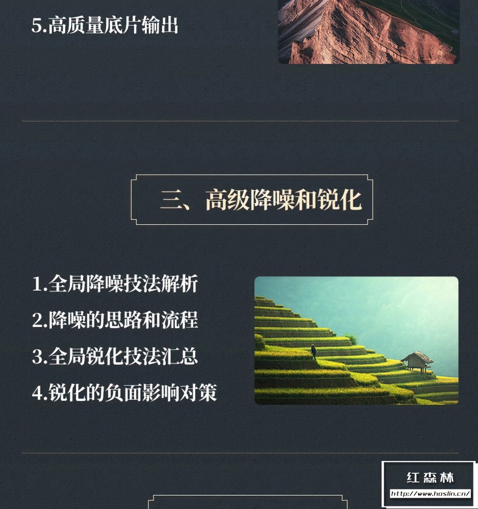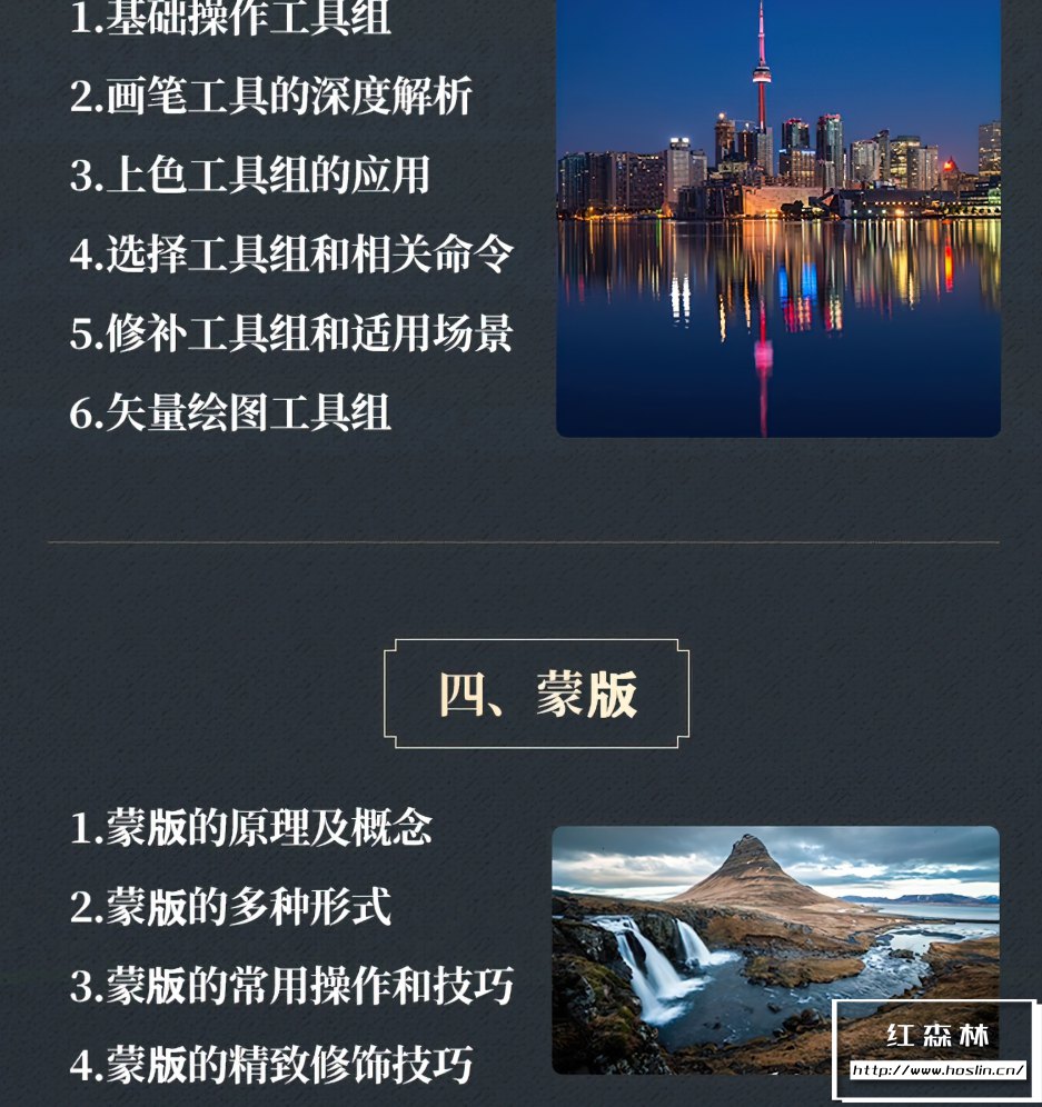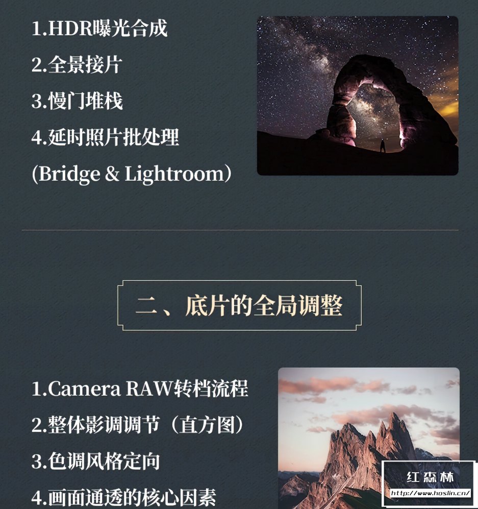 课程从零开始全面讲解风光后期的修图技法,包括Photoshop基础及软件工具应用、六大合成技术、色彩深入解析、高端影像输出、多场景实操案例演示等多个方面组成,实现从零基础入门达到高端风光修图技法学习。适合对于风光摄影和后期感兴趣的爱好者或者后期从业者,可以达到专业的摄影后期水平。文件大小:14.8G