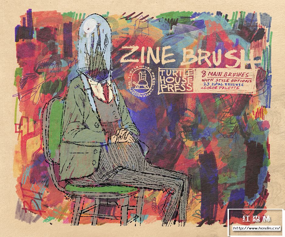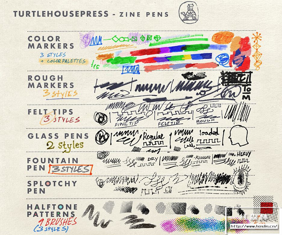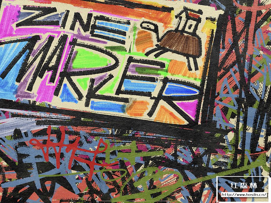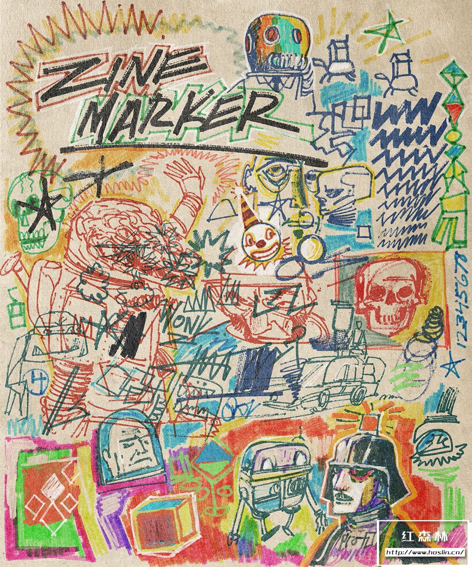 我认为用它们绘画的行为与其他笔不同 – 我制作了玻璃笔和毡尖笔,以便在角落里有一点出血。如果你把笔放在纸上 – 当你在刚刚做的标记上画一条线时,它就会像真正的墨水一样渗到纸上。大多数这些画笔的边缘都没有锯齿 – 但它们是高分辨率的 – 这样,选择就干净,并且我在构建丝网印刷分色时使用其中一些,所以我想要非常清晰的边缘。而且,它们看起来更像是影印的 – 杂志风格,我喜欢这一点。彩色 Zine 记号笔具有独特的颜色堆积,使东西看起来非常手工制作 – 我提供了一些记号笔托盘来帮助绘制较浅的颜色以及一些有关如何使用它们的说明。
