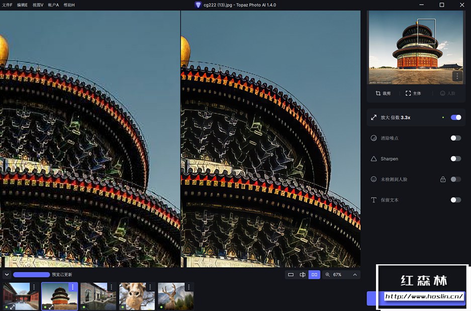 降噪(Topaz Denoise AI)在从数百万张图像中学习后,Topaz Photo AI 的降噪模块可以自动识别您图像的内容。它可以准确的确定真实图像细节和噪点之间的差异,准确度惊人。当然,并非所有图像都会有噪点,对于那些,Topaz Photo AI 将为您提供现代技术所能提供的最佳结果。
