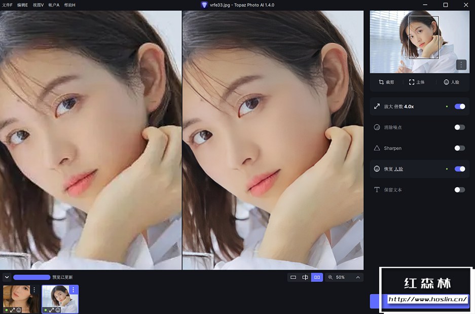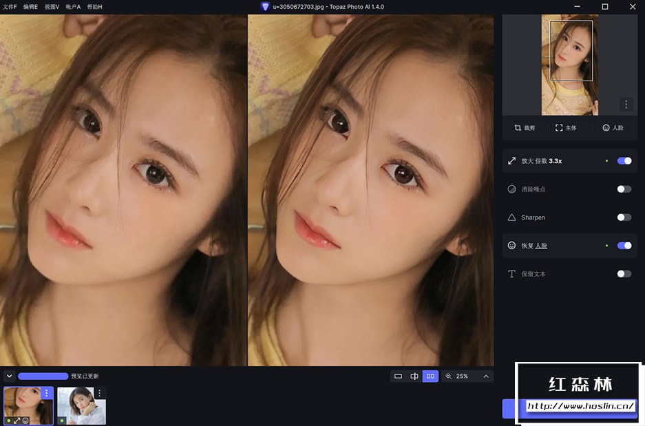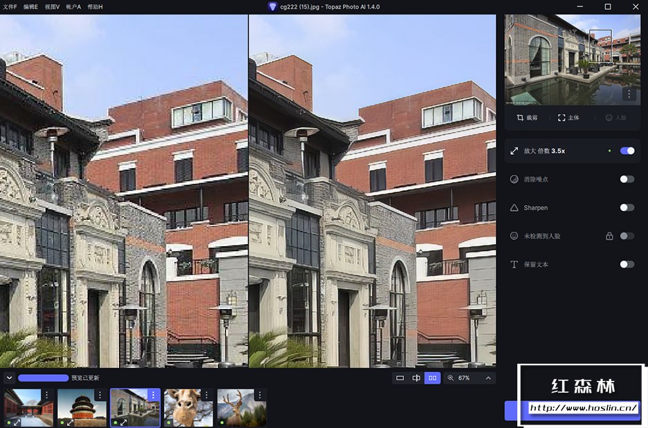 图像增强放大(Gigapixel AI)通常,放大低质量图像只会得到(更大的)低质量图像。而Topaz Photo AI 是不同的。放大时,它会记住数百万张相似图像中的真实细节,并根据这种理解自然地填充缺失的像素。这就像你如何在不亲临朋友面前的情况下描绘朋友的脸。这意味着您可以为您的照片添加真正的分辨率,以获得更紧密的裁剪或更鲜艳的打印效果,以及以前不可能的出色图像质量