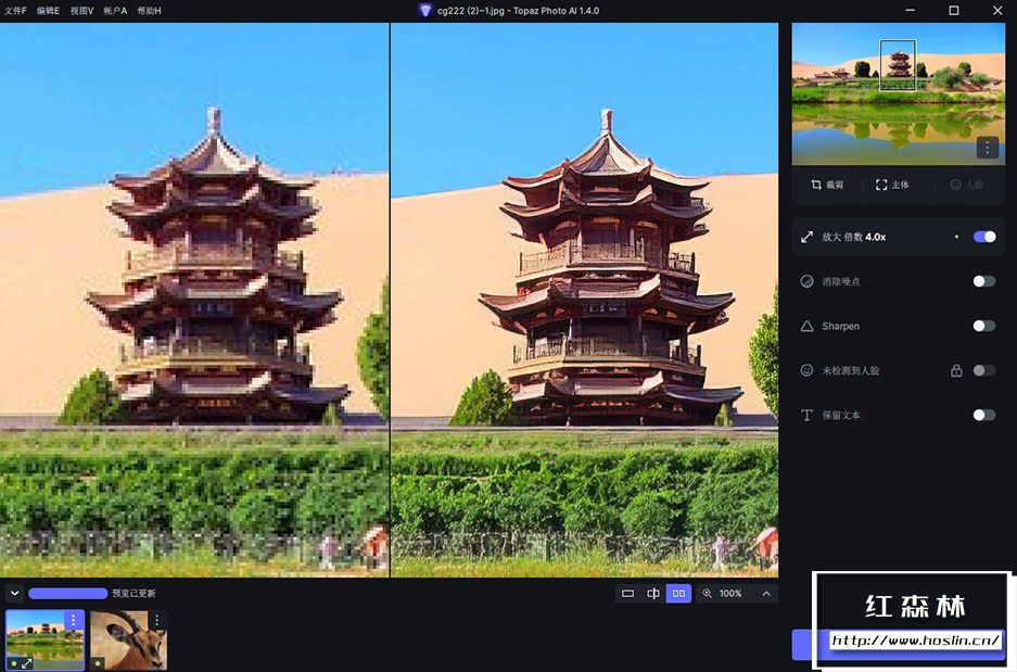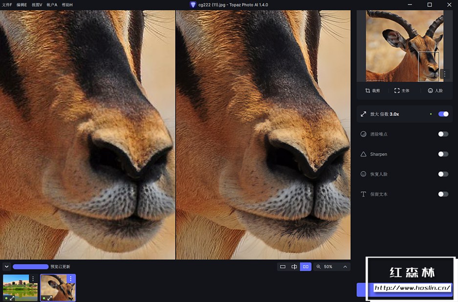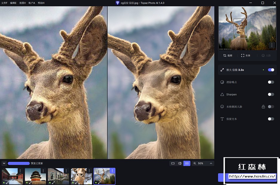锐化(Topaz Sharpen AI)当您的主题模糊时,您并不一定有机会重拍。在这种情况下,请使用Topaz Photo AI 确保您的照片尽可能清晰。Sharpen AI 模块不像传统的锐化那样认为的增加边缘对比度,而是自然的逆转模糊的根本原因(相机抖动、运动模糊、对焦不正)以创造更自然的结果。在没有模糊的情况下,清晰度仍然存在 – 清晰的细节,没有边缘光晕或其他伪影。