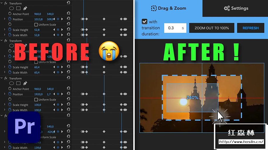 Drag Zoom Pro 扩展可以帮助你在视频编辑中创建平滑的过渡效果,带有自然的动态模糊效果,无需手动调整“位置”和“缩放”参数。你只需点击并拖动鼠标,在画面的某个区域绘制一个矩形,然后扩展会自动设置关键帧和适当的数值。这在处理屏幕录像或采访视频时特别有用。该扩展允许大量可定制性,并包含实现跨项目一致外观的工具。它还支持在分辨率高于时间线的素材上创建带有运动模糊的过渡(这可能会在 Premiere Pro 中导致问题)。