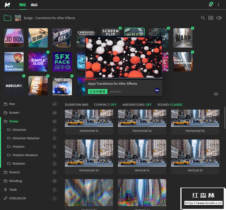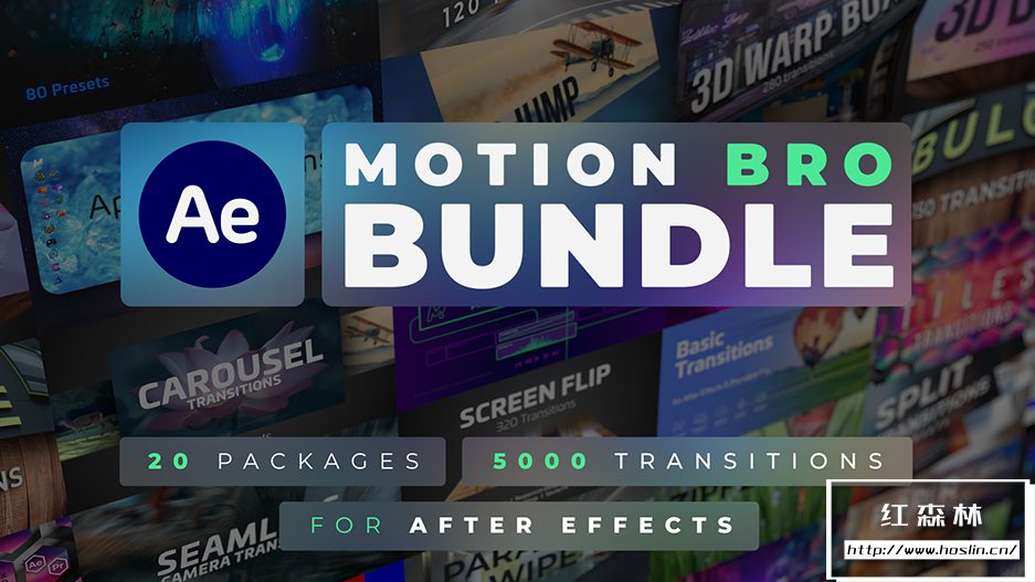 这是一套Motion Bro 预设合集包,包含20种类型的转场预设和1个音效素材,共有5000多种效果预设,由Motion Bro 4.0.4脚本扩展可视化效果预览。选择需要的效果双击即可生成,使用非常简单。