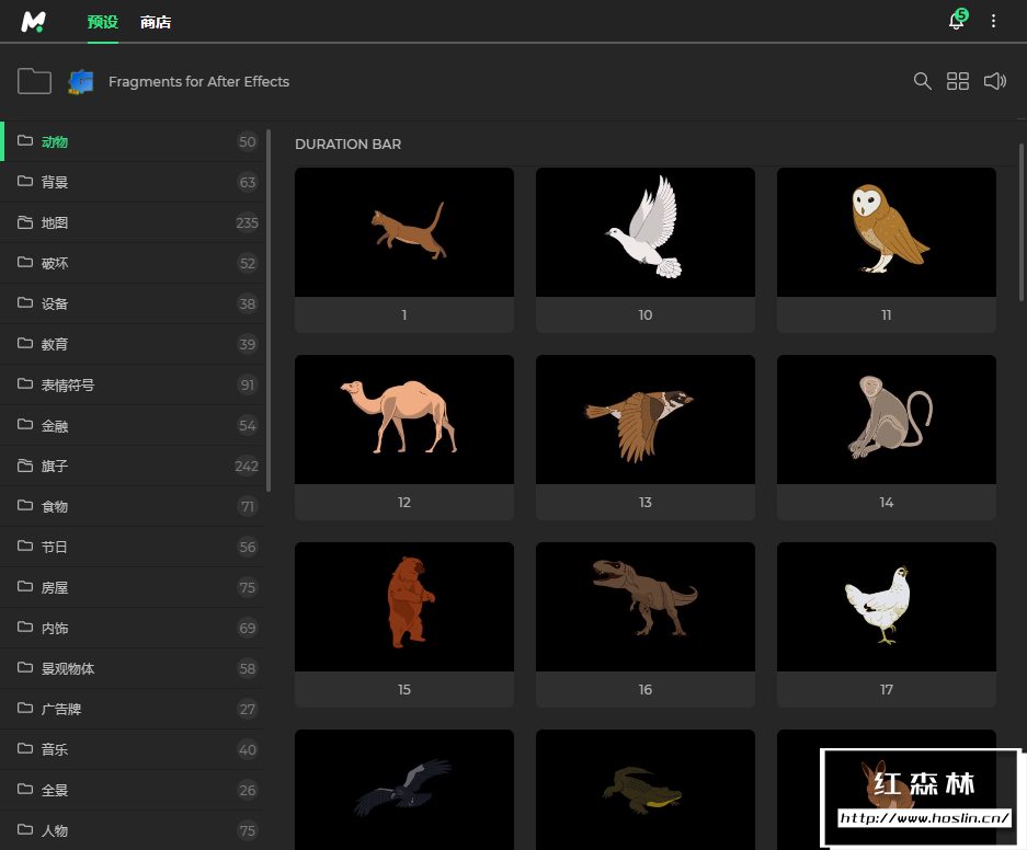 v2升级版共有超过 2450个元素的 30 多个不同类别:动物、背景、国家、破坏、设备、教育、表情符号、金融、标志、食物、假期、房屋、内部元素、景观对象、音乐、全景图、人们、植物、预制场景、展示外墙、简单的图标、社交媒体图标、运动、街道对象、技术、纹理、过渡、运输、旅行、字体、视频、武器、天气等。