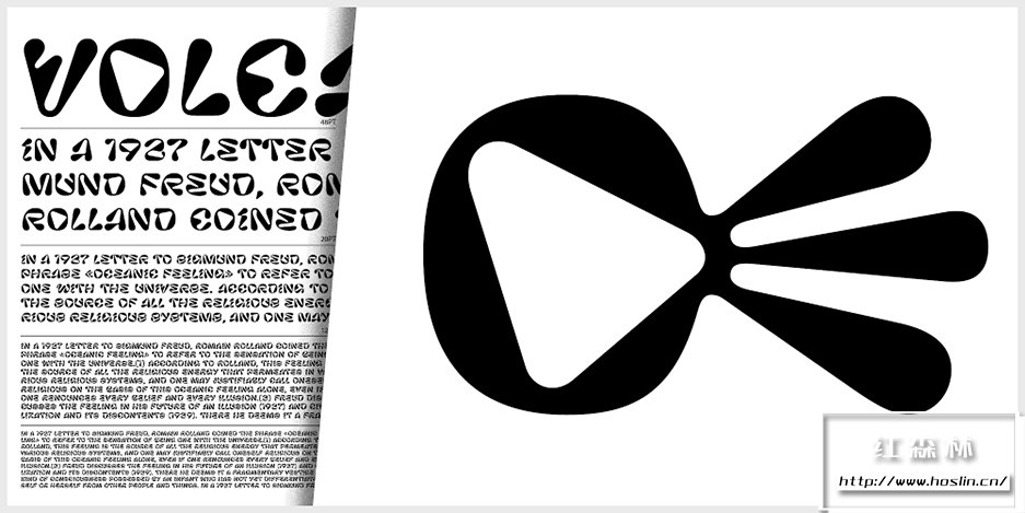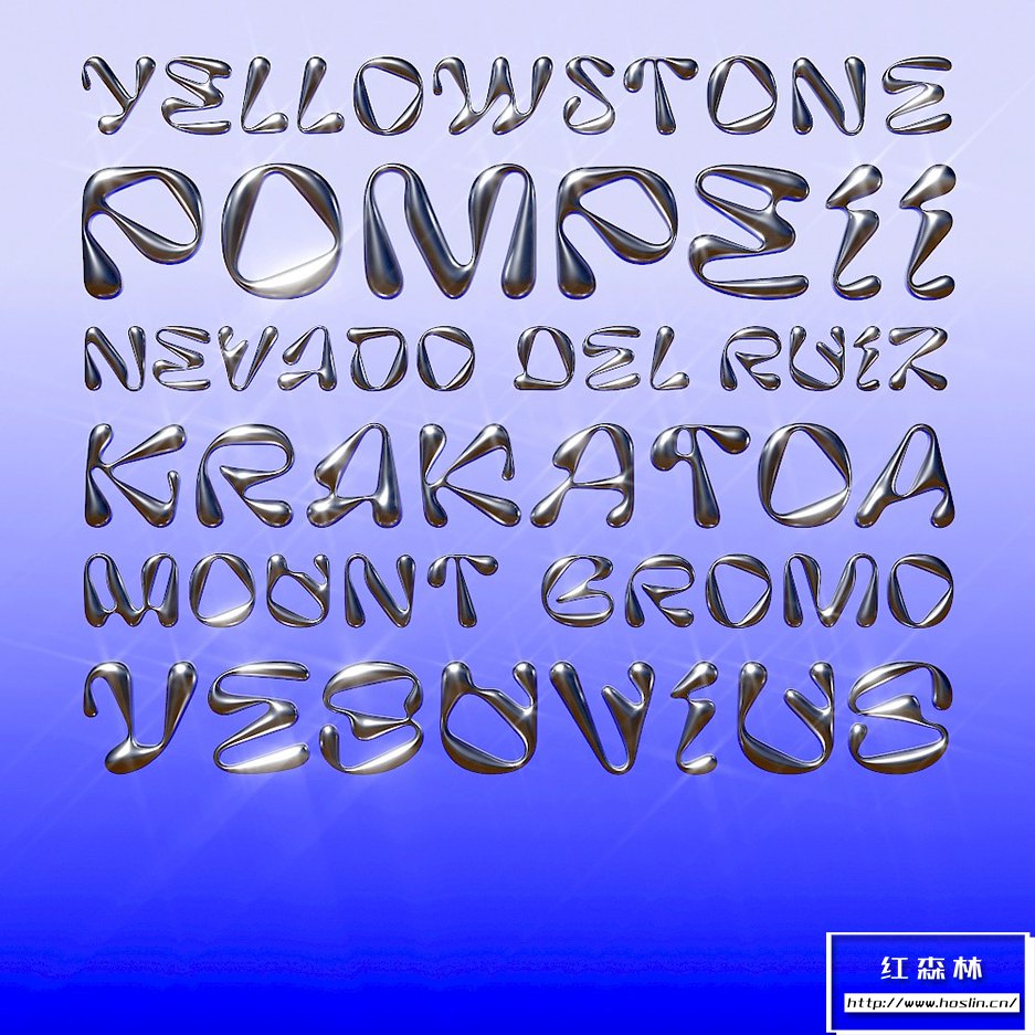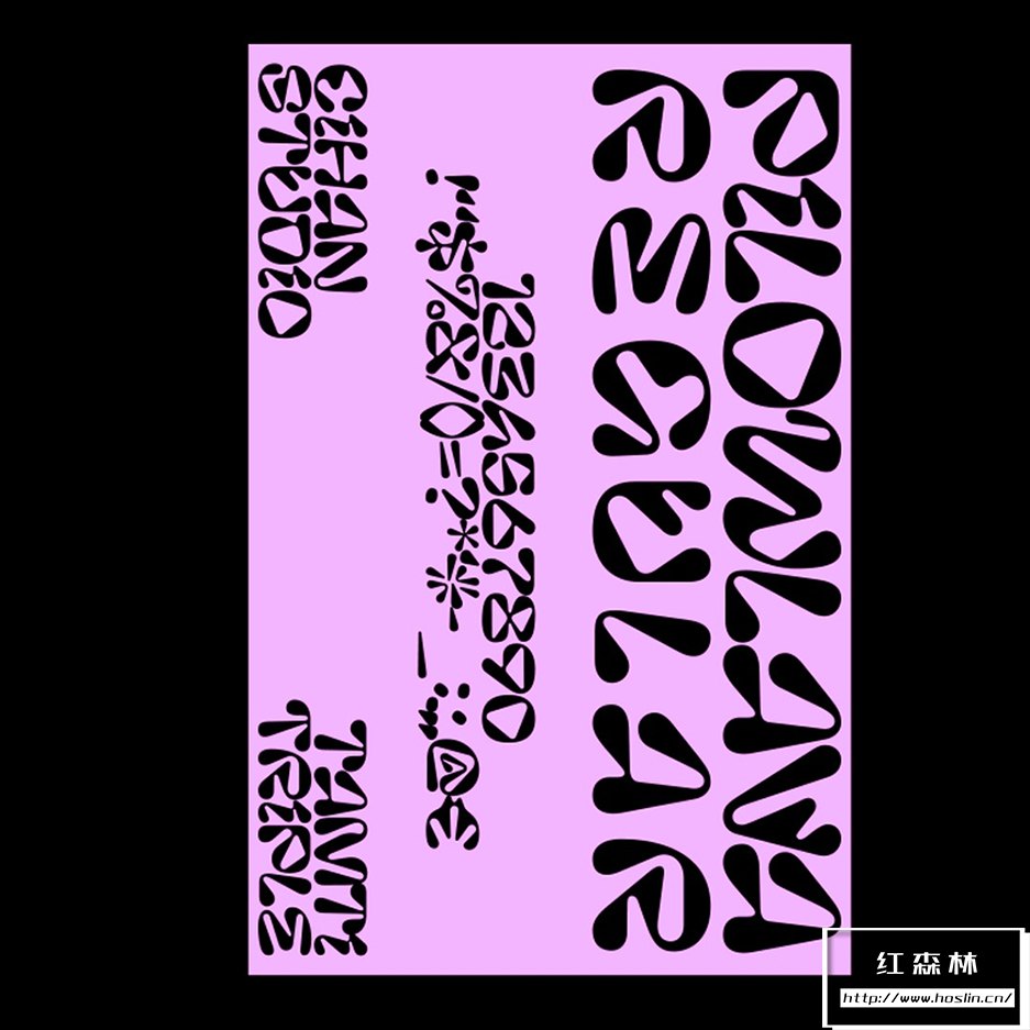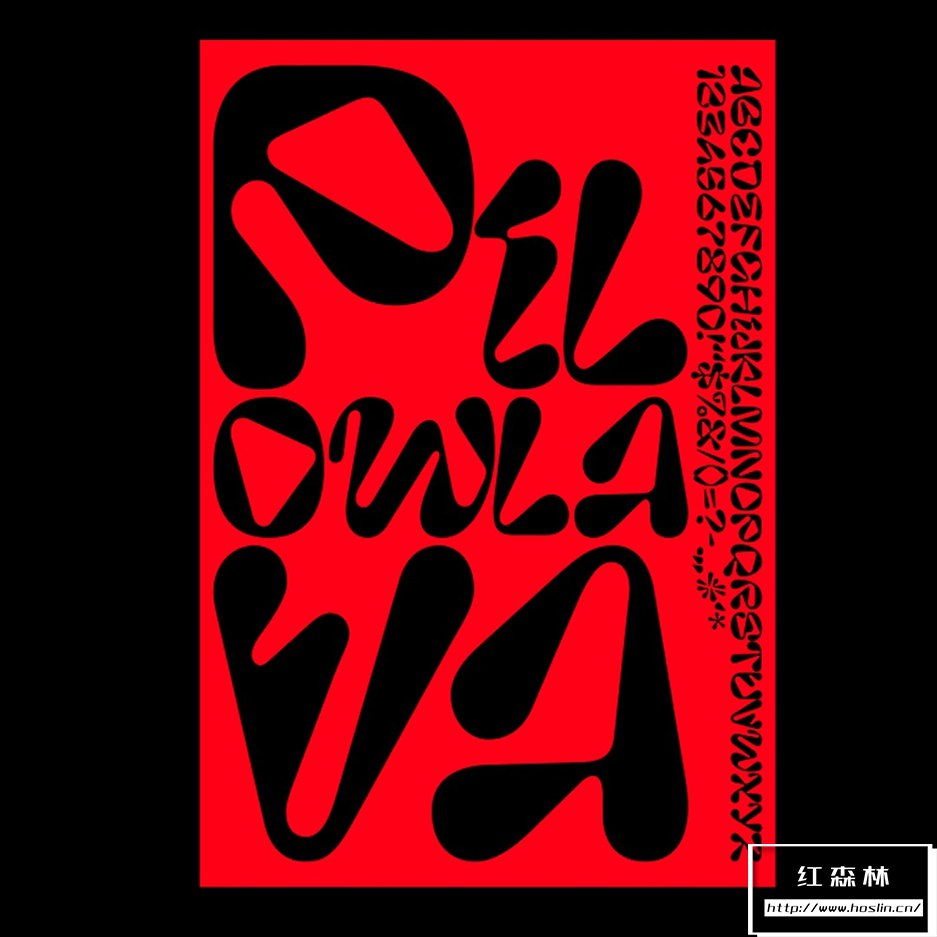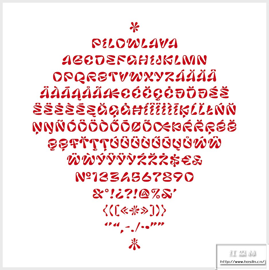据设计师所说,它的名字来自于熔岩在水下环境中迅速冷却、凝结形成的枕状熔岩(外形浑圆,状似枕头),这是一种自然现象。同时,设计师在熔岩粘稠的能量和不受控的几何形状之间取得了一定的平衡,设计出这款极具前卫感、创造性与视觉张力的字体。