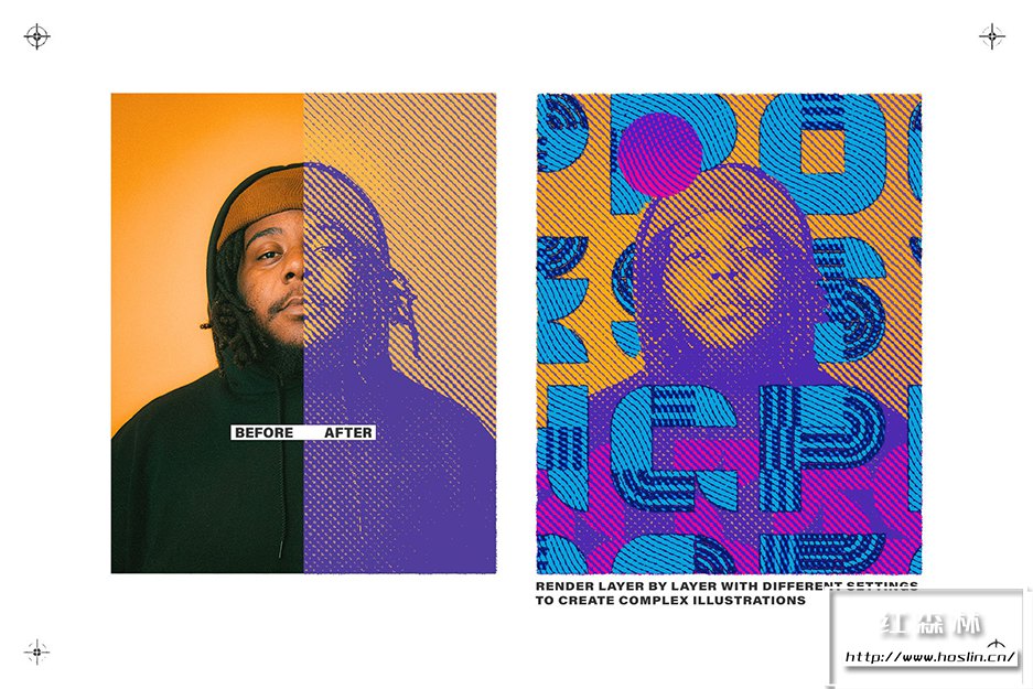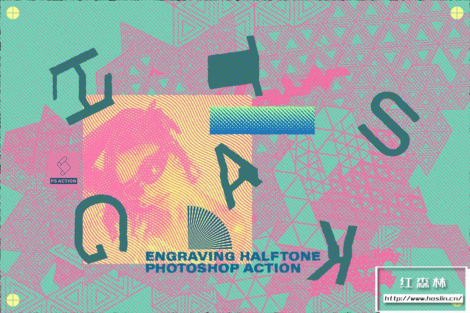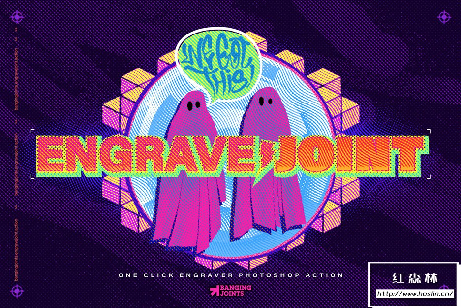EngraveJoint Effect Action 使用简单,选择一个图层,按下播放键,然后观看您的照片呈现迷人的雕刻半色调效果,增加深度和纹理。非常适合创建海报、专辑封面、社交媒体图形、像素化排版等等。