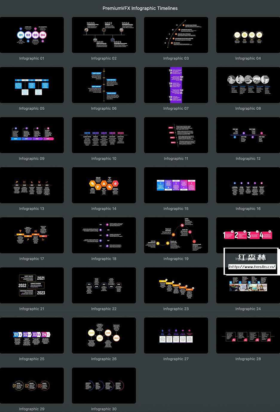 Infographic Timelines 是一组时尚精美的商务企业发展历程时间线信息图表展示动画,,包括线性、曲线、环形、条形等。他们使用简单,您可以方便的修改文字内容、颜色、字体、大小等。包含视频教程。