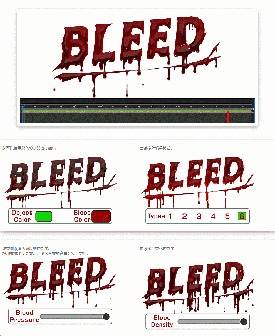 - 包括可控的SFX音效。音效根据血液滴落的速度而变化。