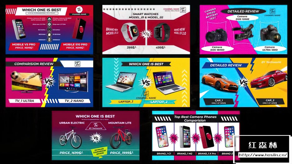 Versus Intros 模板包含 8 个产品比较与介绍。您可以编辑文本占位符、媒体占位符并调整颜色以满足您自己的需要。您可以将它们用于产品评论和比较视频。包含视频教程。