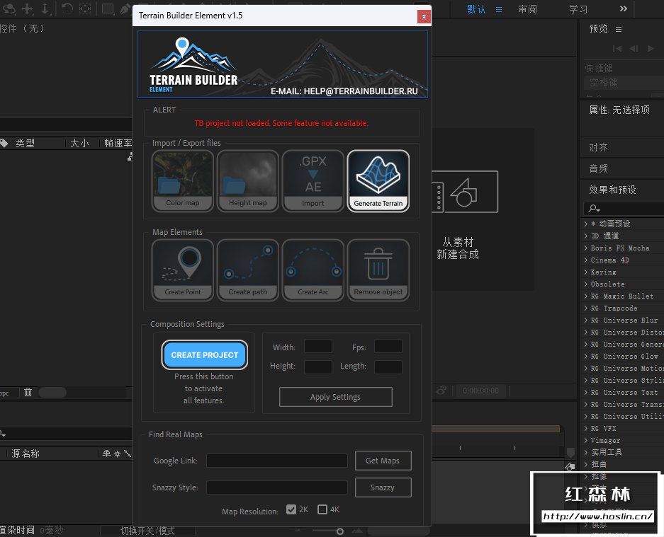 警告!!!:需要 Element 3D 插件(VideoCopilot)。不支持 C4D Lite 包括 Terrain Builder Cinema。脚本使用的谷歌地图国内网络访问可能会受限制。