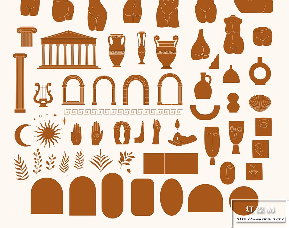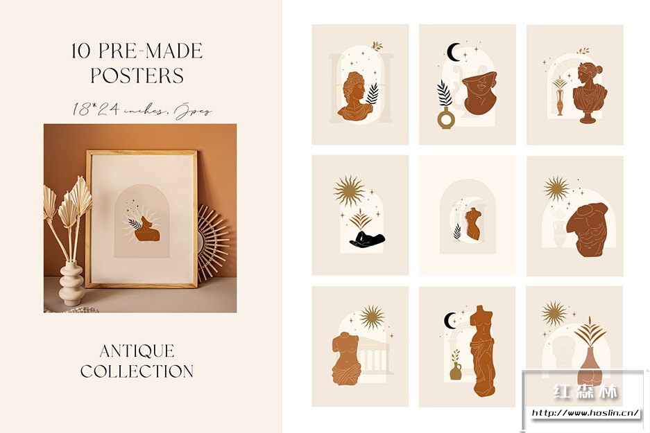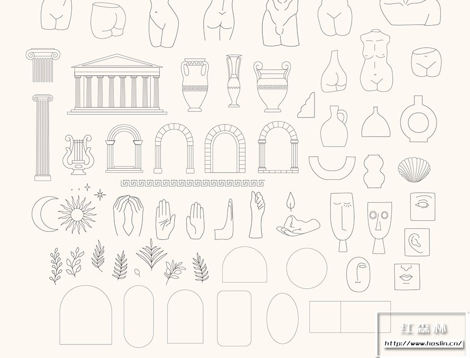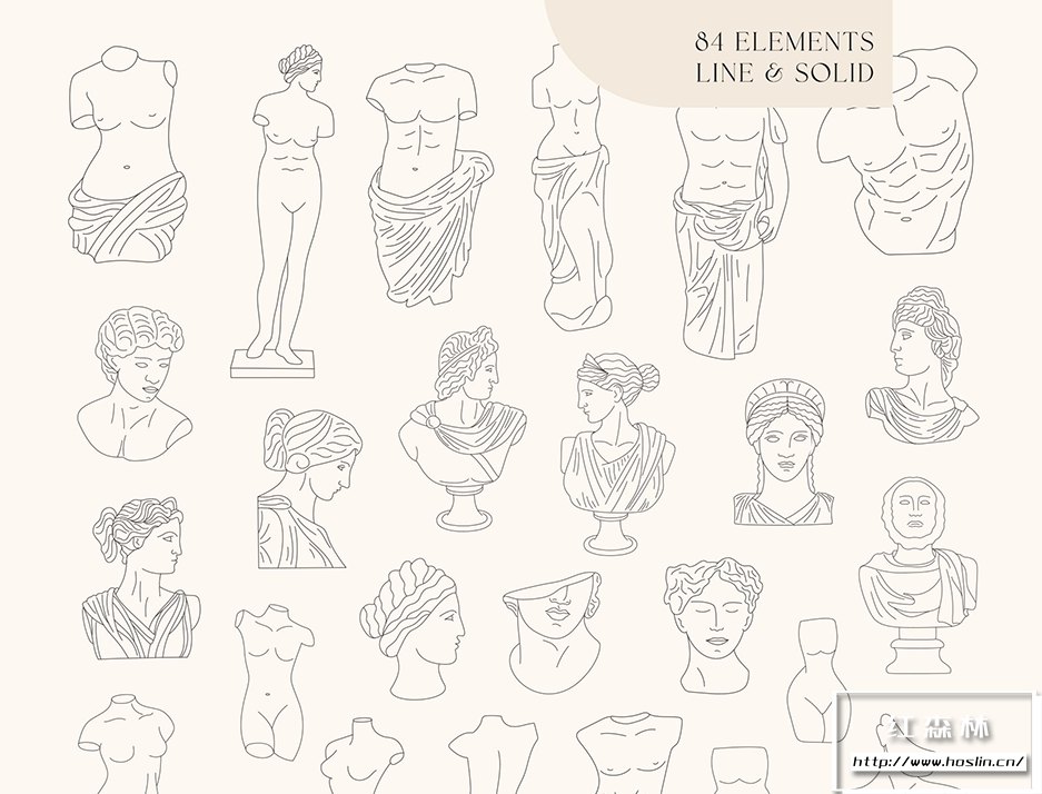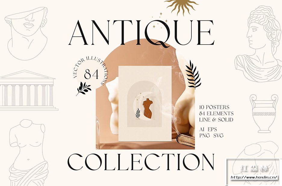我很高兴展示我的新系列!古董收藏– 84 个轮廓和立体插图以及 10 个墙壁艺术印刷品。该系列包括神话人物、著名雕像、手、拱门、树叶和徽标框架的手绘插图。该系列非常适合网络和印刷、徽标、社交媒体帖子、邀请函、蜡烛和家居装饰品牌、珠宝、博客等等!