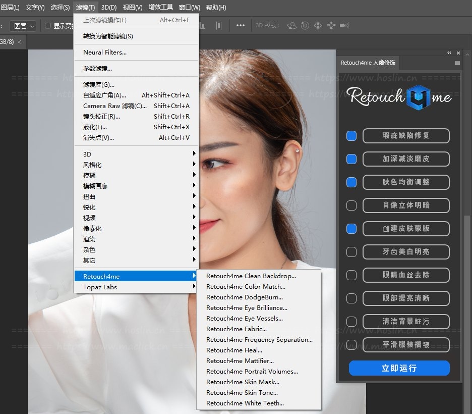 大名鼎鼎的3D LUT CREATOR团队开发的AI智能人能磨皮美容软件Retouch4me系列,现在一共有十三款软件。这是一套基于神经网络的人像照片快速精修工具,它功能强大,内置了包括Portrait、Dodge Burn 、Clean Backdrop等十三个人像修饰插件,基本上涵盖了人像处理中的方方面面:光影、磨皮、去瑕疵、美白等效果一应俱全。同时它基于神经网络,使得操作简单易上手,是一套备受推崇的经典插件。在PS里还集成了扩展面板方便使用,共包含: