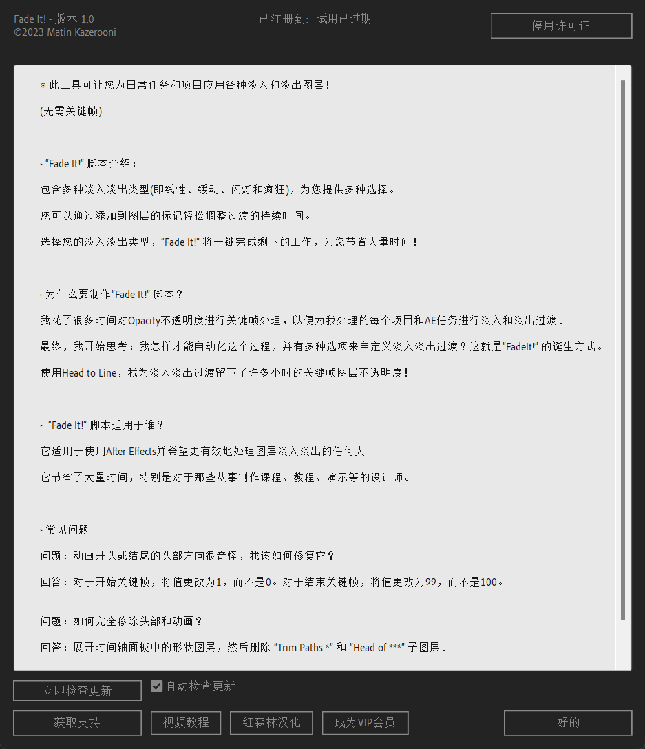 Fade It!是一款用于Adobe After Effects脚本工具。它可以帮助用户快速、简单地为图层添加各种可调节的淡入淡出过渡效果,从而节省制作过渡动画时手动设置透明度关键帧的时间和精力。Fade It!可以添加多种动画类型,如Linear线性,Ease缓动,Ease In缓入, Ease Out缓出, Blink闪烁, Crazy疯狂等。您只需通过添加到图层的标记轻松调整过渡的持续时间,然后选择您的淡入淡出类型,“Fade It!”将一键完成剩下的工作,为您节省大量时间!