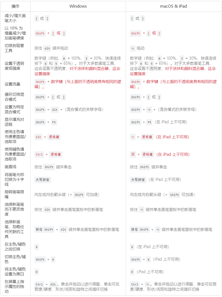 更新后的核心画笔快捷键列表如下所示(新增内容以红色突出显示):