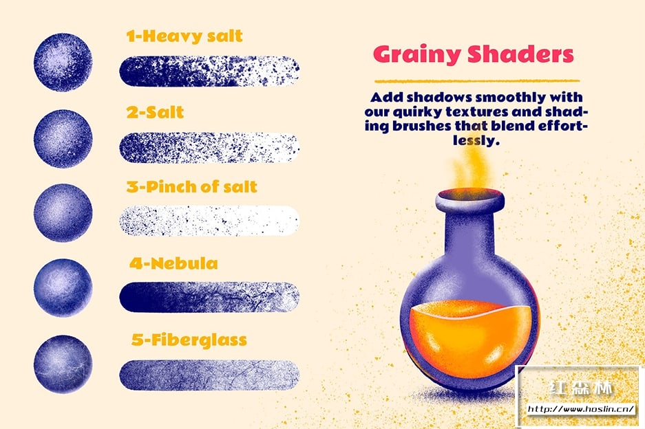 亲爱的创意人士,认识你们最喜欢的新画笔!该笔刷组是从现实生活中的纹理中采样的,并经过数字处理以形成无缝图案。它们旨在为您的插图和刻字艺术品添加一些现实主义和异国情调。该套装分为 2 个主要部分,提供10 个阴影画笔和 15 个纹理画笔,对于 Photoshop 版本,我们还包括2 个额外的纹理画笔。您将能够使用画笔平滑地添加阴影,轻松无缝地混合。给你的作品一些魅力!