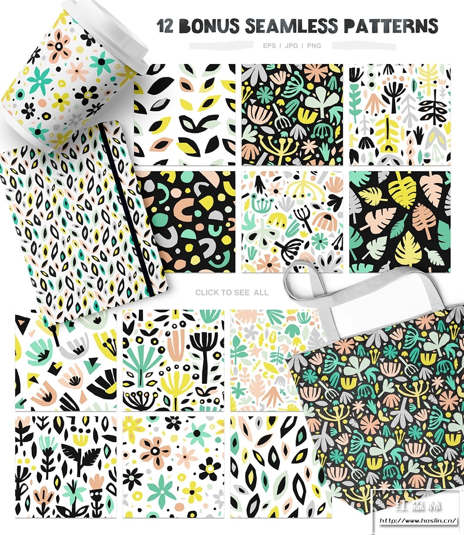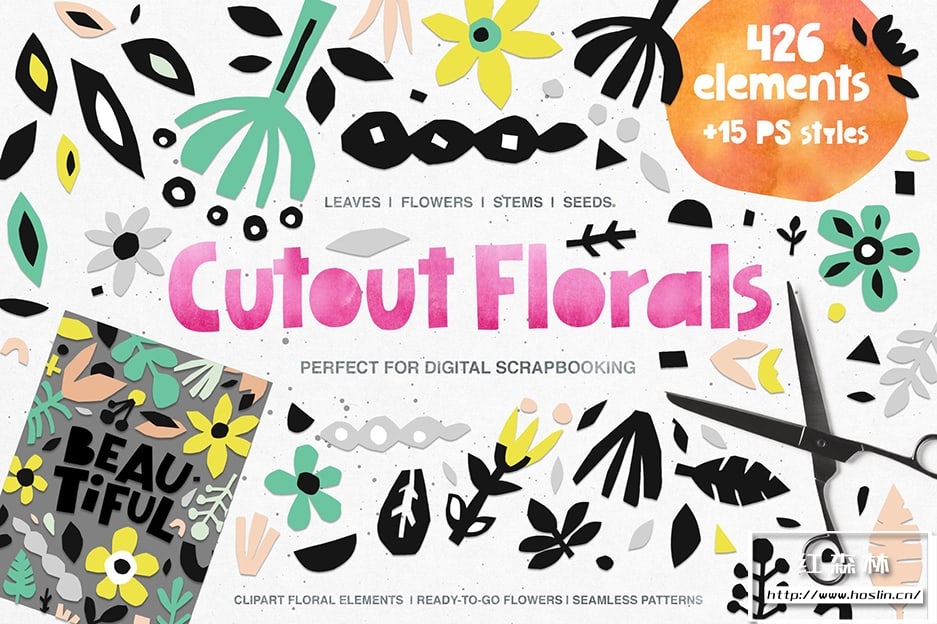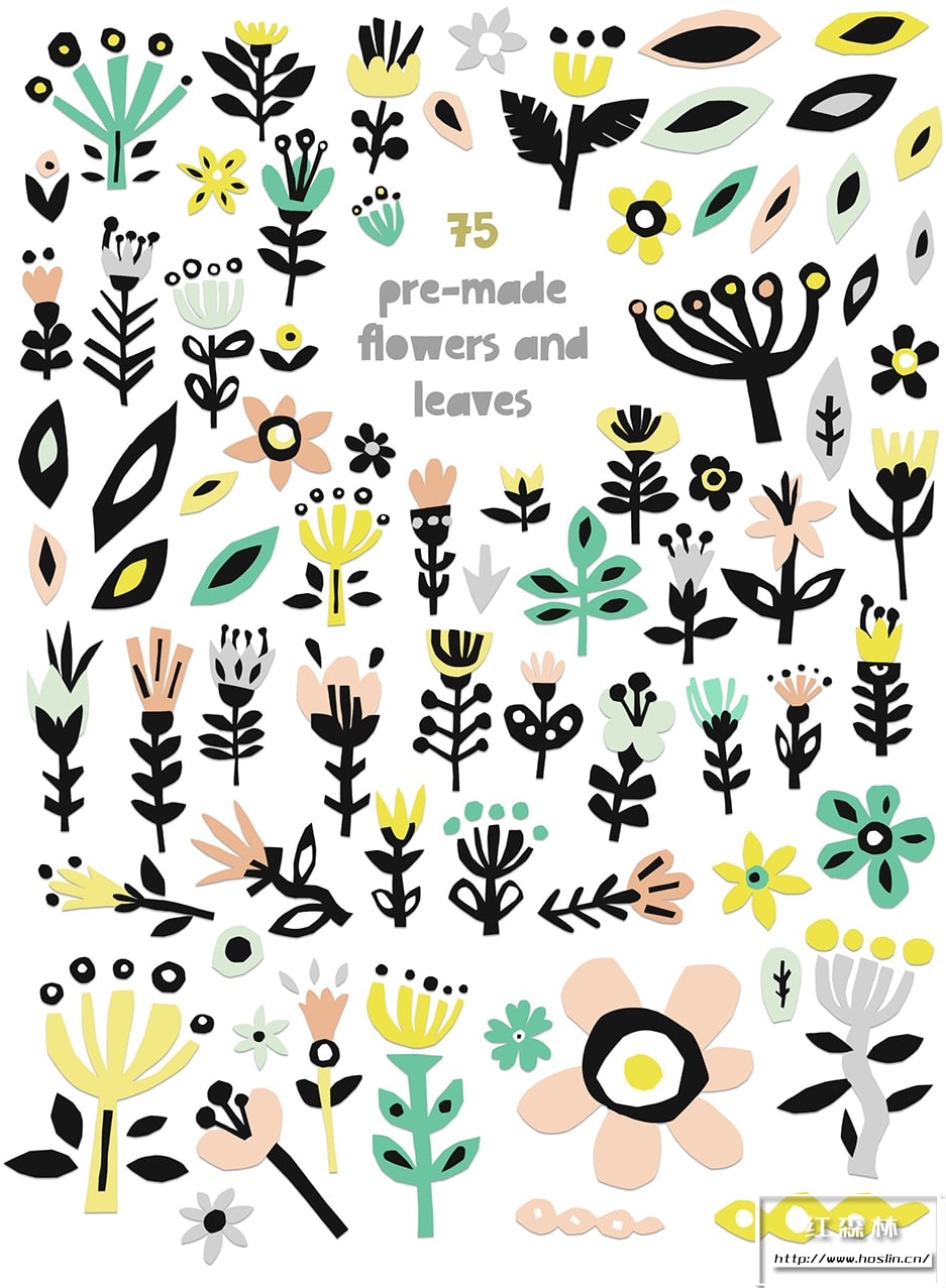 剪纸花卉是花卉元素(茎、叶、花、种子等)的一个大集合,这些元素实际上是从纸上剪下来,然后仔细数字化的。您将获得 400 多个独立的元素,以及 75 种现成的花朵、12 种无缝图案和 15 种水彩 Photoshop 样式,这些样式将帮助您一键添加一些漂亮的纹理(还包括如何使用样式的说明) 。
