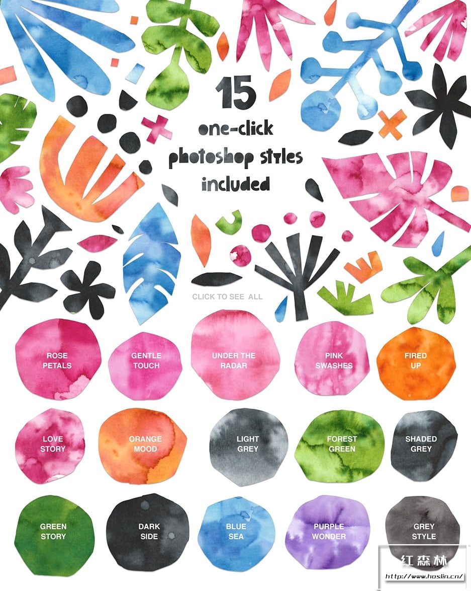 - 15 种水彩 Photoshop 样式 – 您需要 Photoshop CS5 或更高版本才能使用这些样式 (ASL)