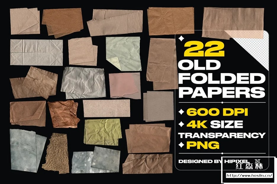 Old Folded Papers 拥有22 张旧折叠纸适用于任何图像,您可以将它们用于任何图形设计项目!项目特色:文件格式:PNG;22张透明折叠纸;600 DPI 分辨率,4k尺寸!文件大小:194M
