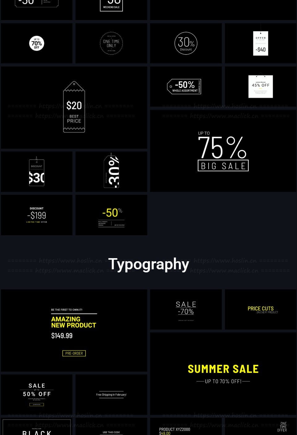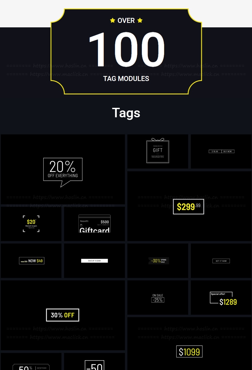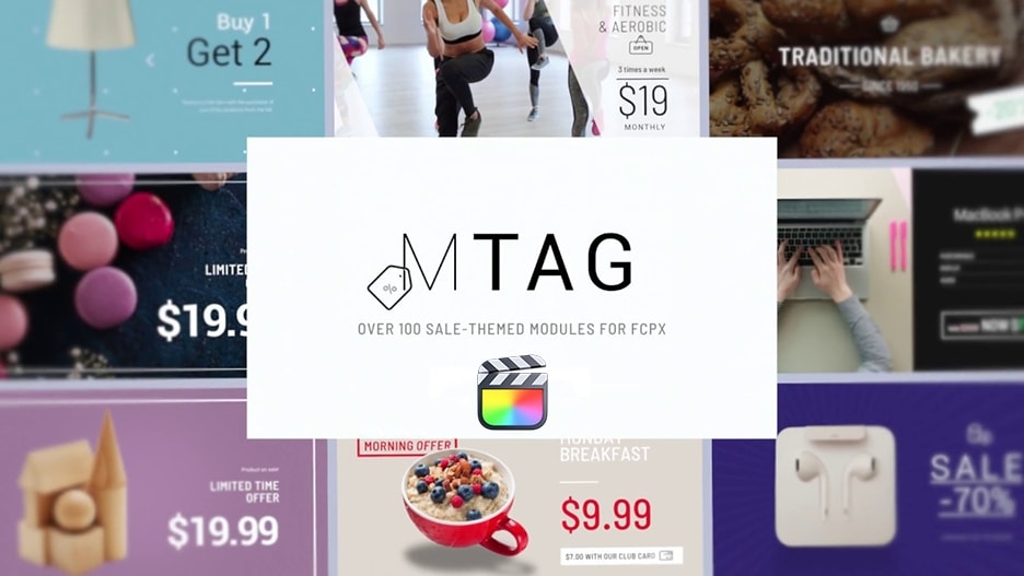 mTag 拥有超过100个FCPX专属的促销主题模块,包含商品价格标签动画、文字标题、图标ICON、背景动画、商品展示等元素,使用方便的控制器直接在屏幕上轻松排列内容。引人注目价格和销售工具展示,充满了专为宣传您的产品而设计的出色设计。文字、字体、占位符、颜色、大小位置等属性可修改。