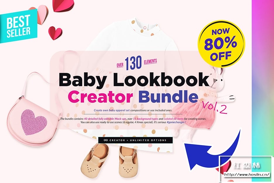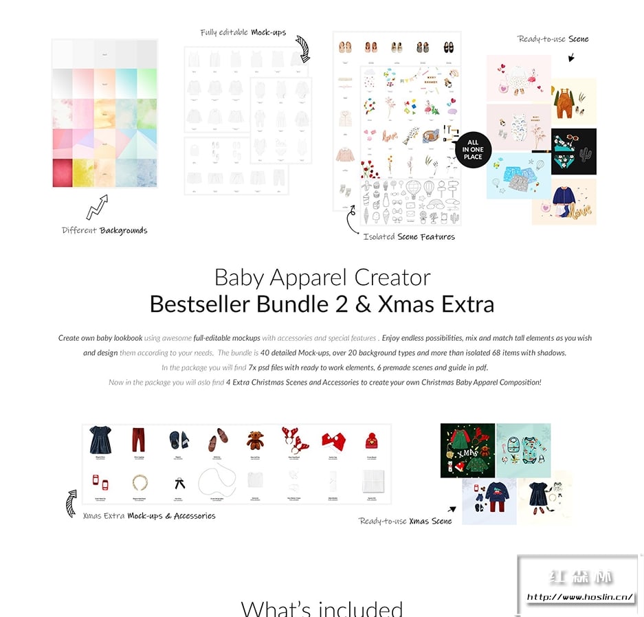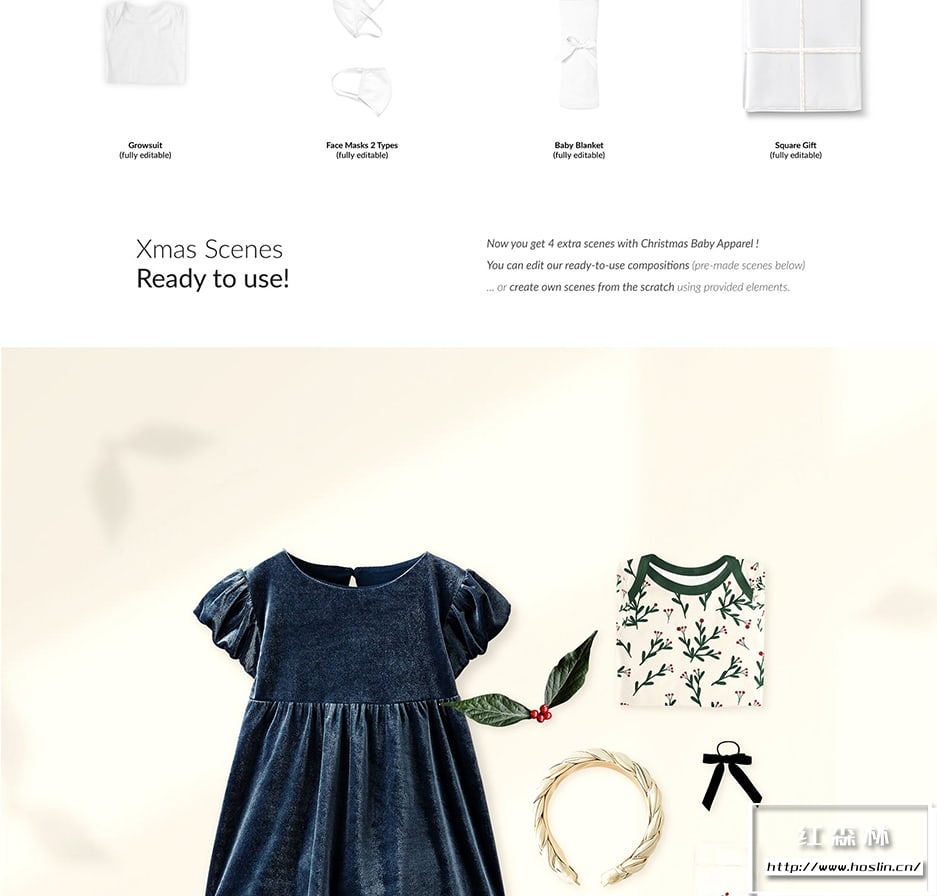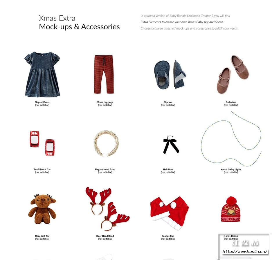 • + 圣诞额外模型和配件 在 Baby Bundle Lookbook Creator 2 的更新版本中,您将找到额外的元素来创建您自己的圣诞婴儿服装场景。在附带的模型和配件之间进行选择,以满足您的需求。