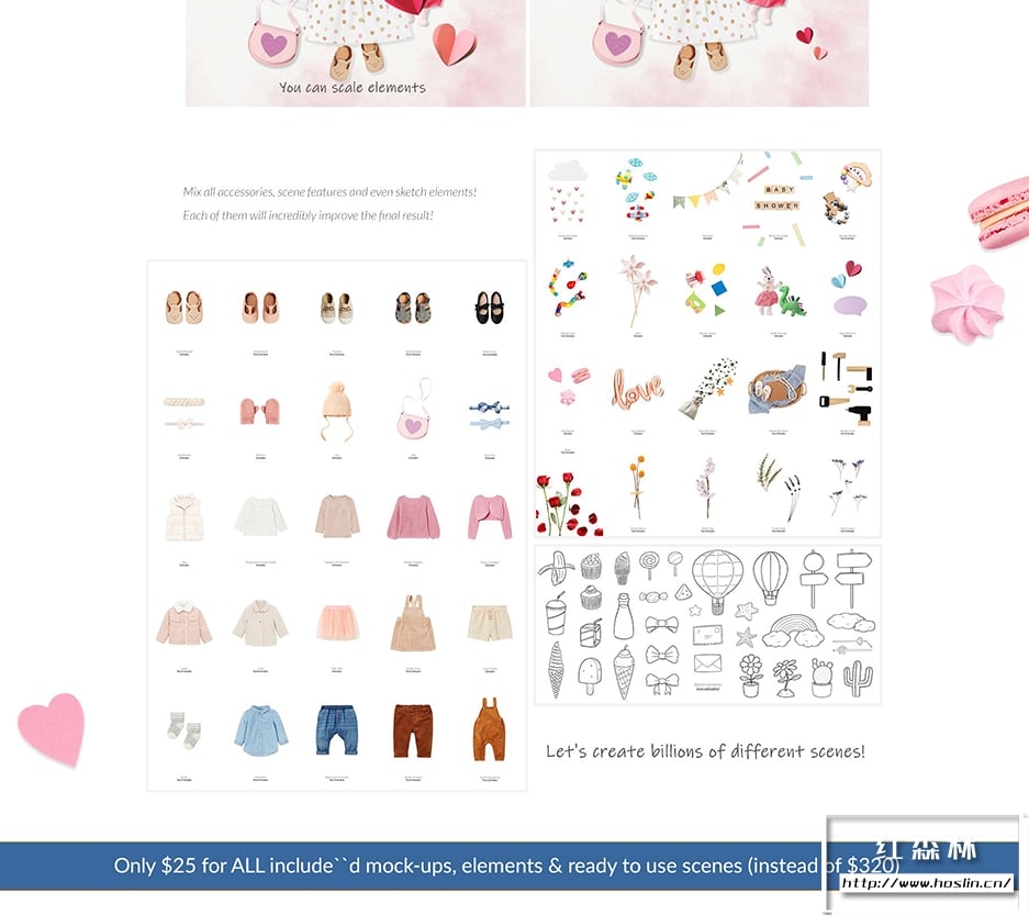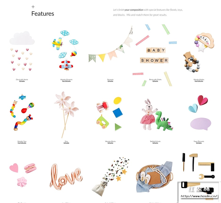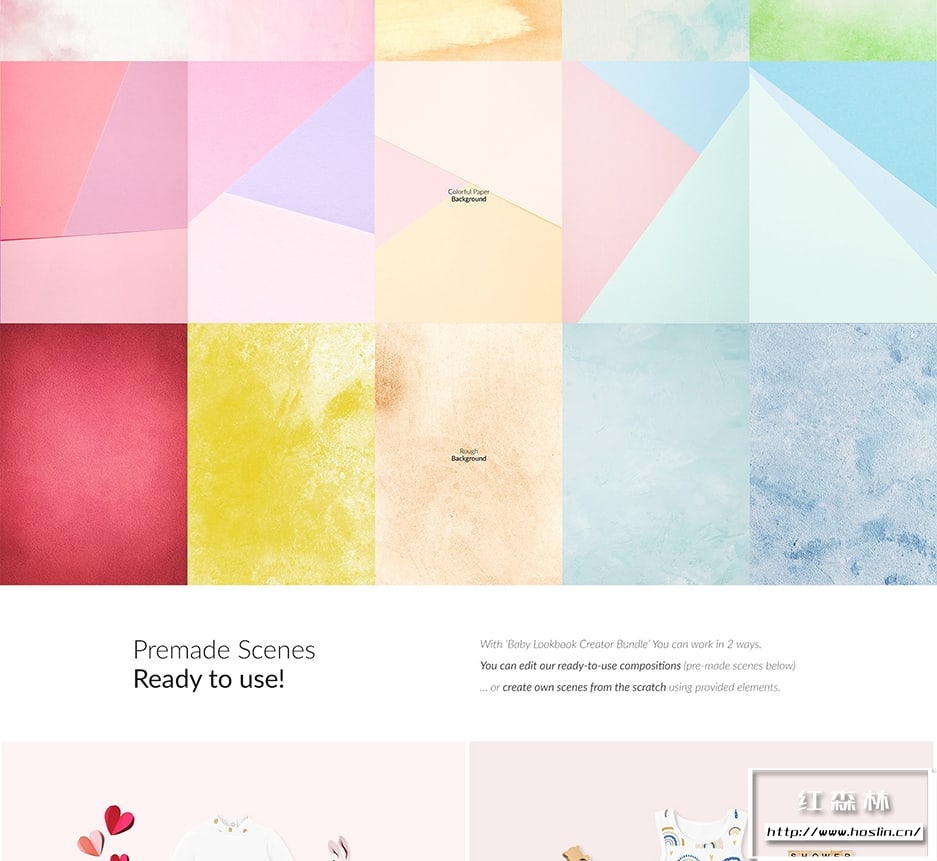 • + 预制场景即可使用! 借助“Baby Lookbook Creator Bundle”,您可以通过 2 种方式进行工作。您可以编辑我们现成的合成(下面的预制场景)…或使用提供的元素从头开始创建自己的场景。