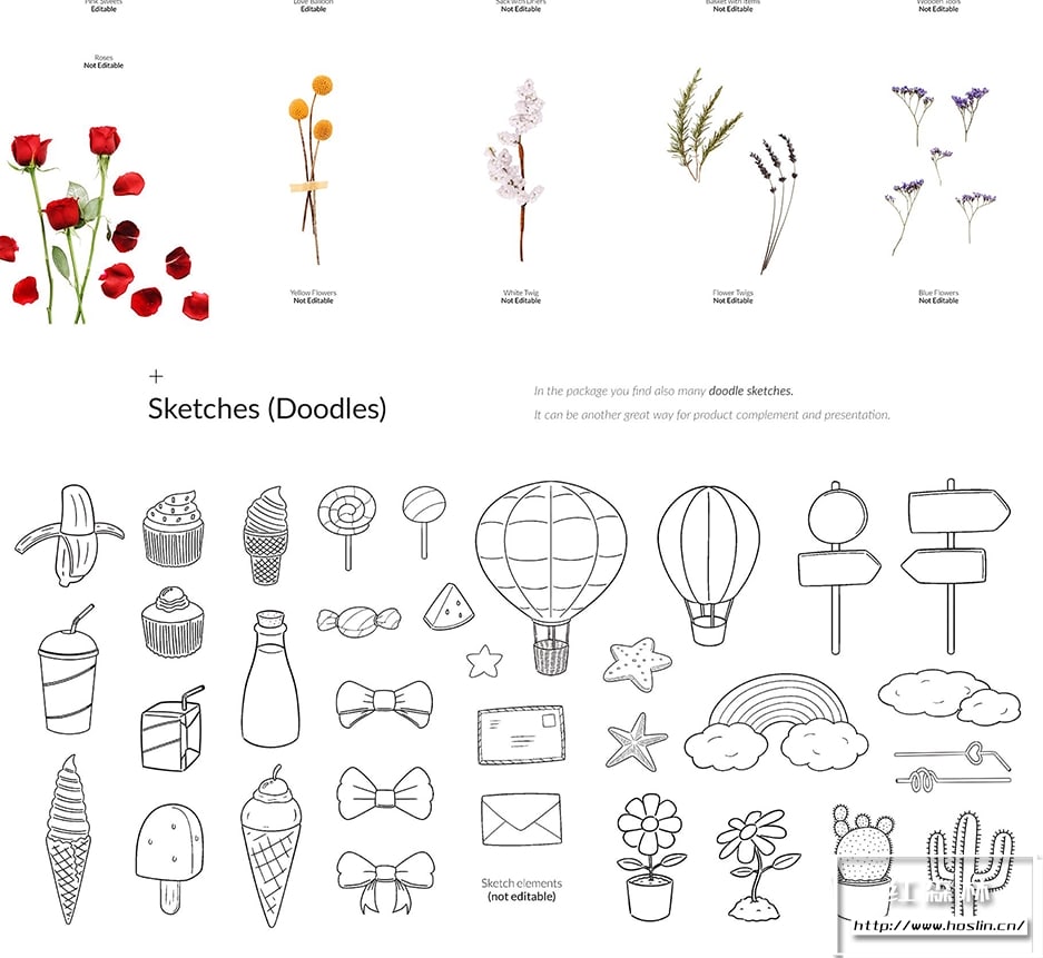 • + 草图(涂鸦) 在包装中您还可以找到许多涂鸦草图。这可能是产品补充和展示的另一种好方法。