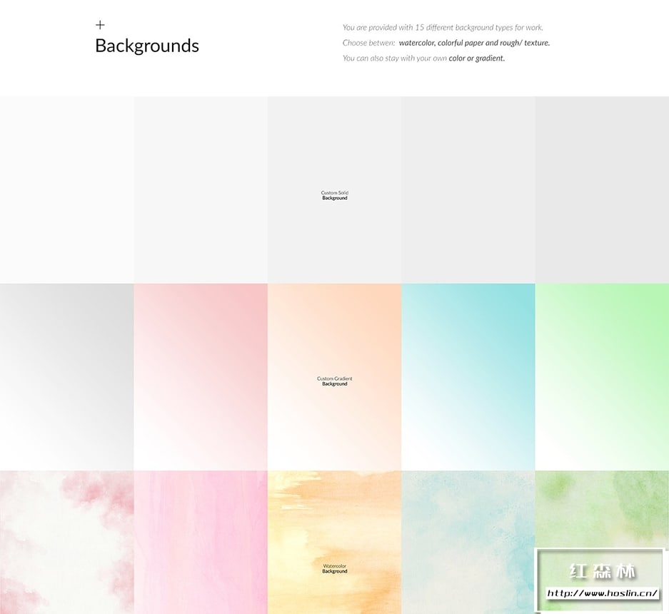 • +背景 为您提供了 15 种不同的工作背景类型。选择:水彩、彩色纸和粗糙/纹理。您还可以保留自己的颜色或渐变。