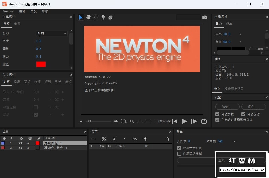 使用Newton4在After Effects中释放真实物理效果,将 2D 图层转换为真实世界对象的真实模拟。微调对象动力学(密度、摩擦力、弹跳等)并调整重力等全局力以进行全面控制。具有广泛的系统套件,包括可定制的关节、Waterlike 浮力、Triggermatic 交互、传送等等。Newton4 使您能够构建复杂的装备,以逼真的精度进行响应,同时保持可编辑关键帧的灵活性,以便进行模拟后调整。Newton是AE的一款牛顿动力学插件,完美模拟动力学的物理属性,操作方便快捷,全新的操作界面、关节、吸附与排斥、新动力学类型等诸多实用功能。重力,碰撞,摩擦,弹跳,密度,速度等控制,制作出更加真实的效果。