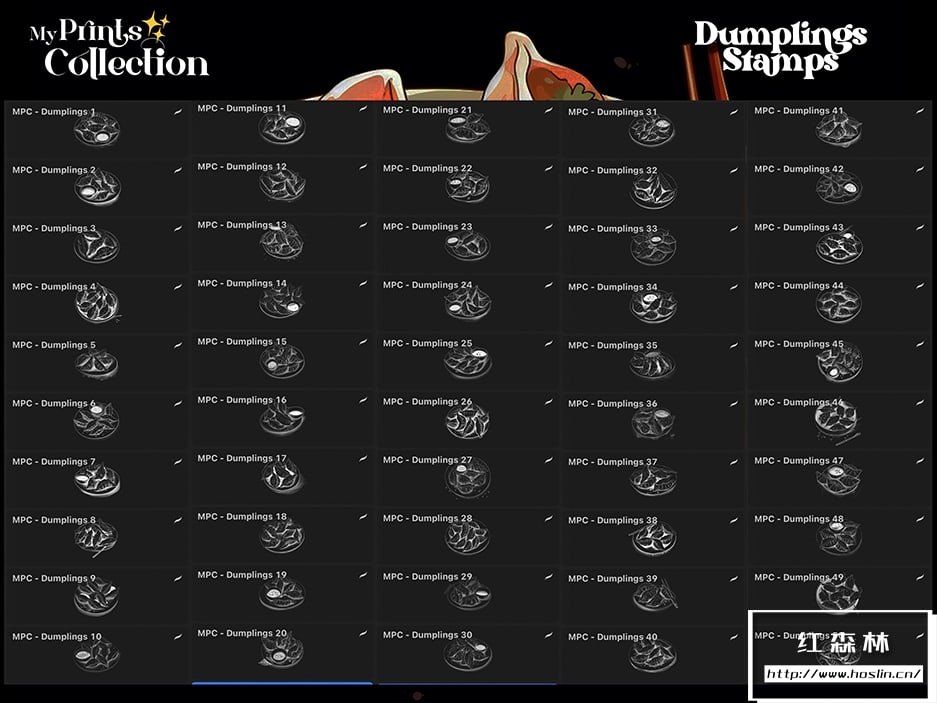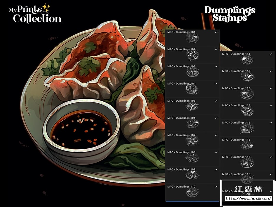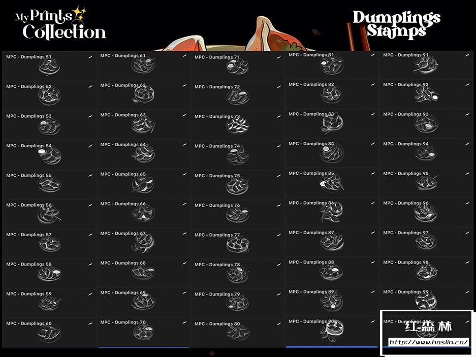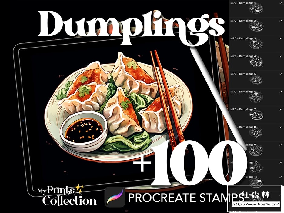 - +100 个高品质 Procreate 印章(.brushset 文件):每张印章都经过精心制作,为您的艺术作品提供清晰详细的饺子插图。