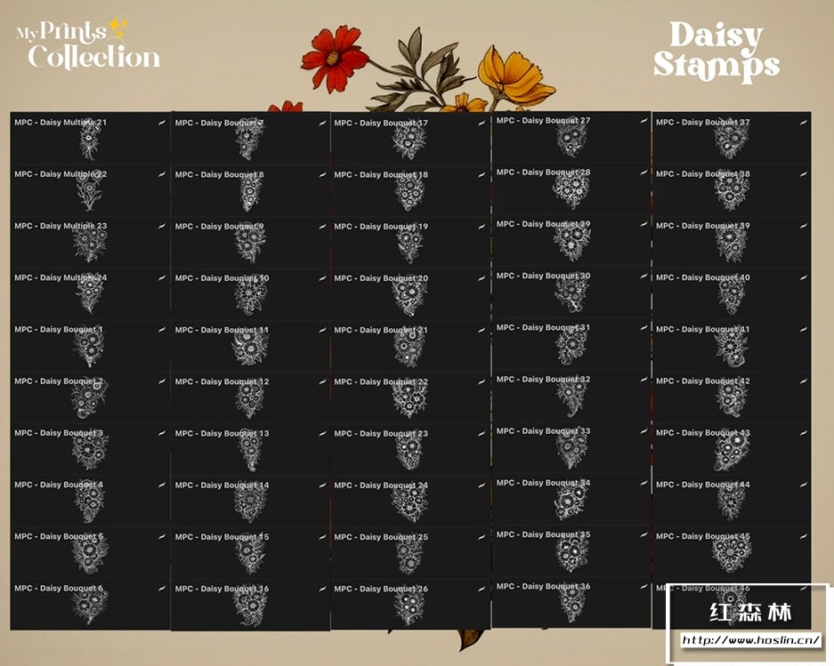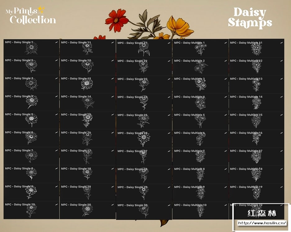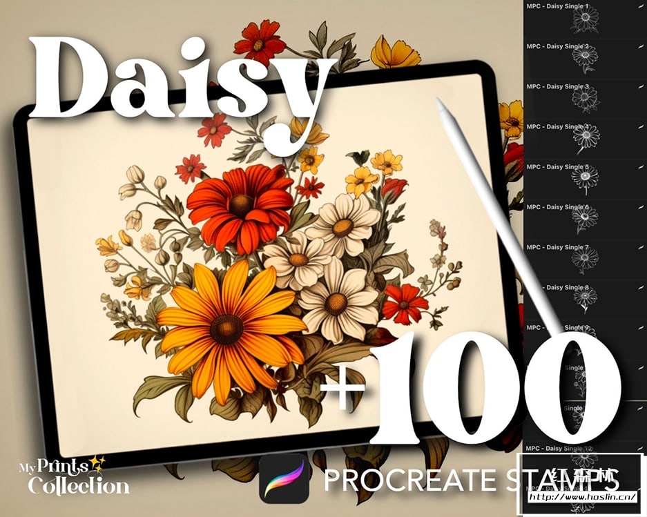 - +100 个高品质 Procreate 印章(.brushset 文件):每张印章都经过精心制作,为您的艺术作品提供清晰详细的雏菊插图。