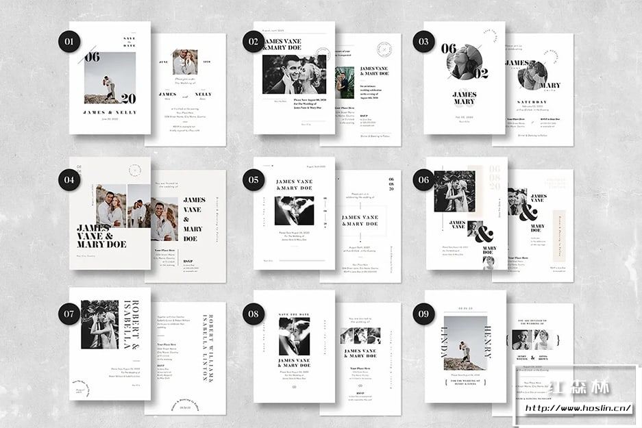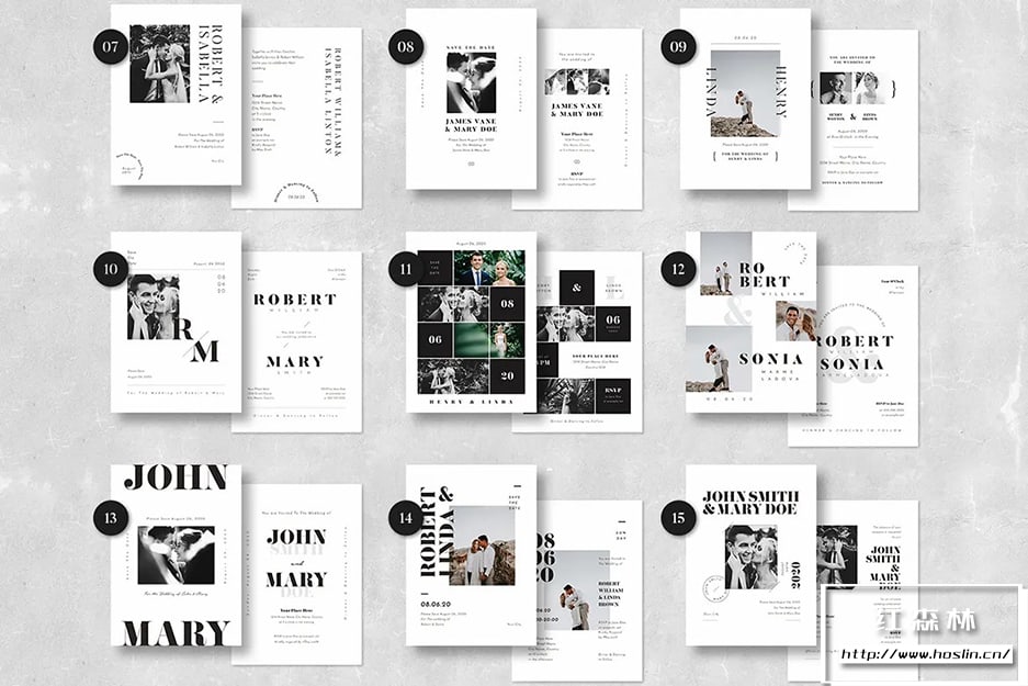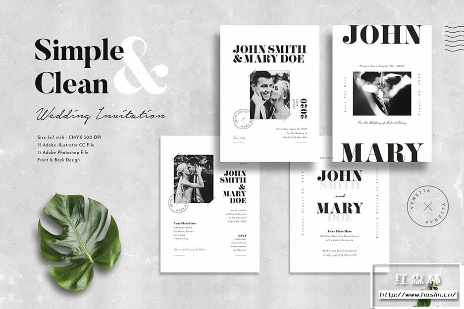 简单干净的婚礼请柬设计,适合您的婚礼!15 种现代布局的婚礼请柬可供选择。每个设计有 2 页,氛围邀请函的首页和背面。