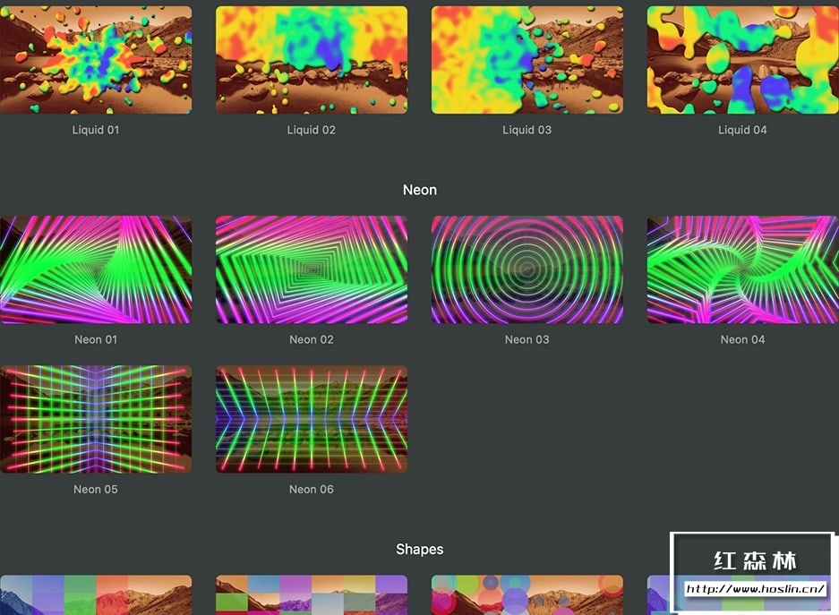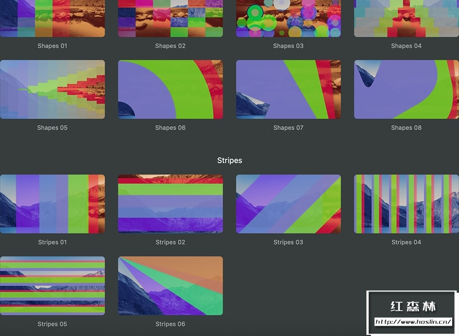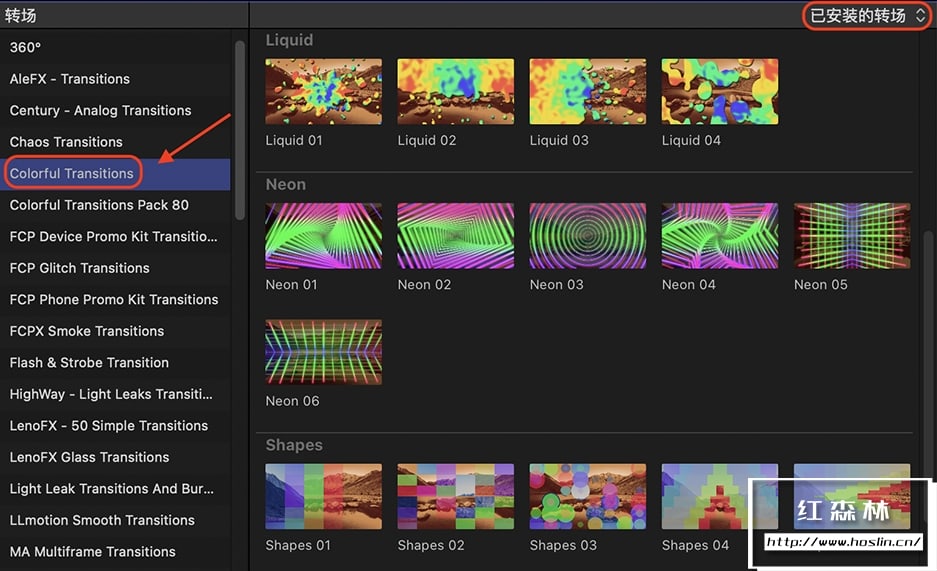 插件 Colorful Transitions提供了30种丰富多彩的过渡效果,涵盖了不同设计风格的类别,如卡通、液体、霓虹、形状和条纹等。这些过渡效果可以为视频添加颜色和创意,给观众耳目一新的感觉。您可以自定义颜色、透明度、亮度、发光等参数,包含视频教程。