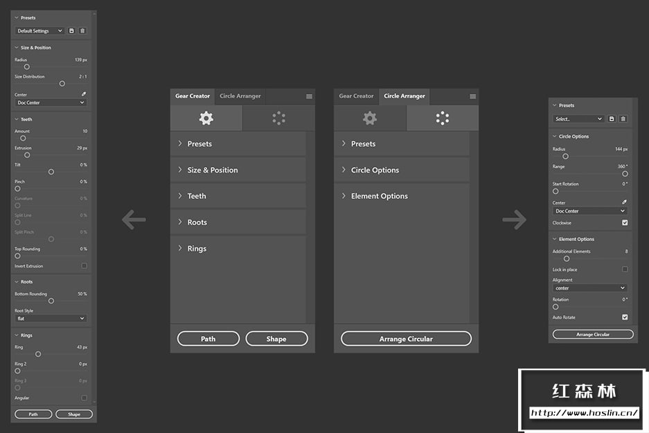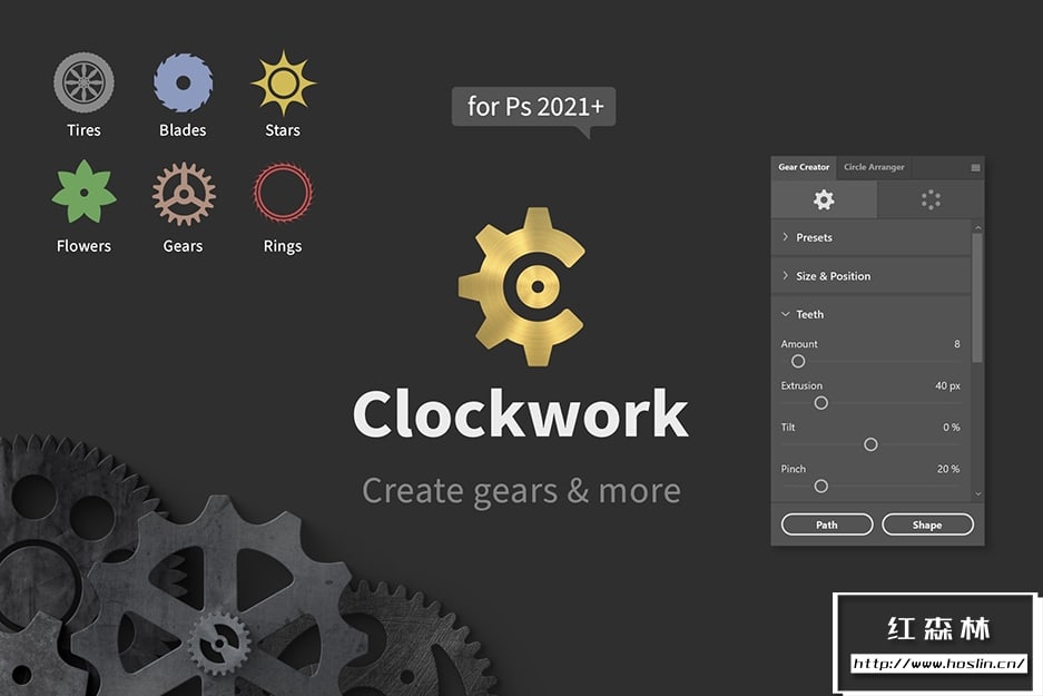 Clockwork 可让您轻松构建复杂的圆形设计和形状!该插件提供了许多设置,可让您控制生成的形状的每个小细节,同时在拖动滑块时为您提供即时的视觉反馈。它包括两个面板 – 齿轮创建器和圆形排列器 – 彼此完美互补,并且可以通过选项卡导航轻松访问。