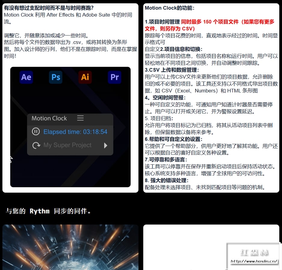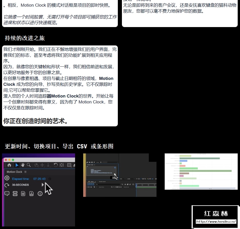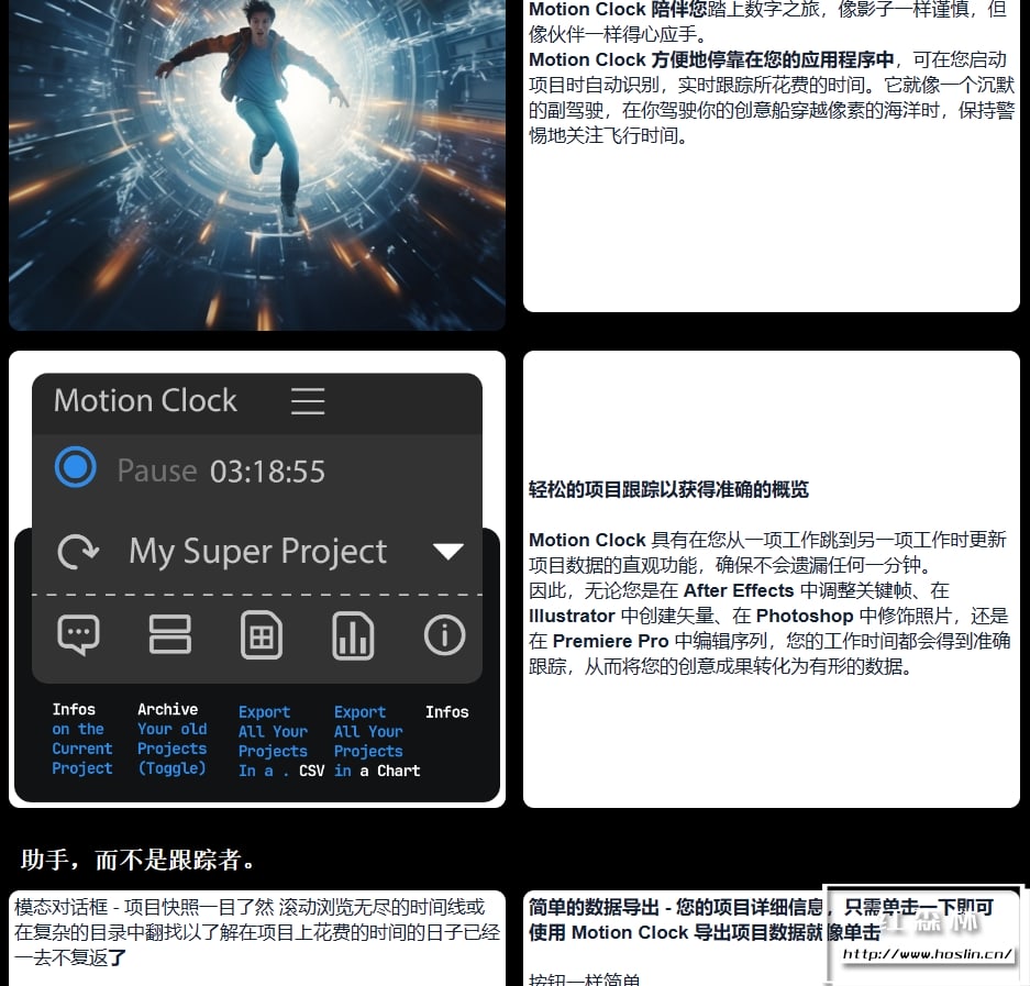 使用 Motion Clock脚本在所有 Adobe Creative Suite 应用程序(After Effects、Illustrator、Photoshop 和 Premiere Pro)中实时准确跟踪和导出(条形图和 CSV)项目小时数。它直观、不显眼,并毫不费力地与您的工作流程同步。Motion Clock确保每一分钟都很重要。不要只跟踪时间,掌握它。