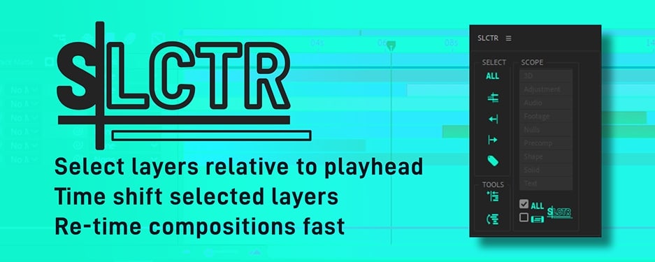 SLCTR 通过根据播放头位置选择图层,轻松重新定时合成。选择选择范围为所有图层或特定图层类型,并能够将您的选择限制为工作空间。然后将选定的图层移动到一起。您还可以指定要选择的范围内的图层类型,并且当您以错误的方式烦人地选择和粘贴图层时,有几个工具允许您将图层移动到播放头位置或翻转它们的顺序。