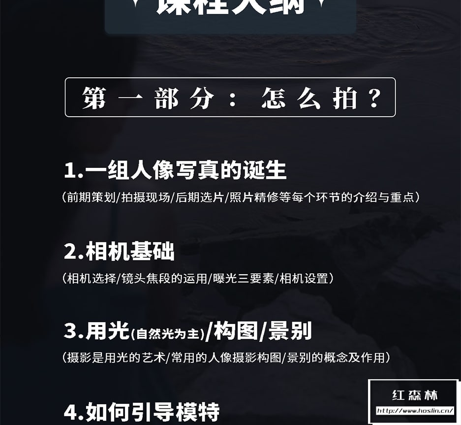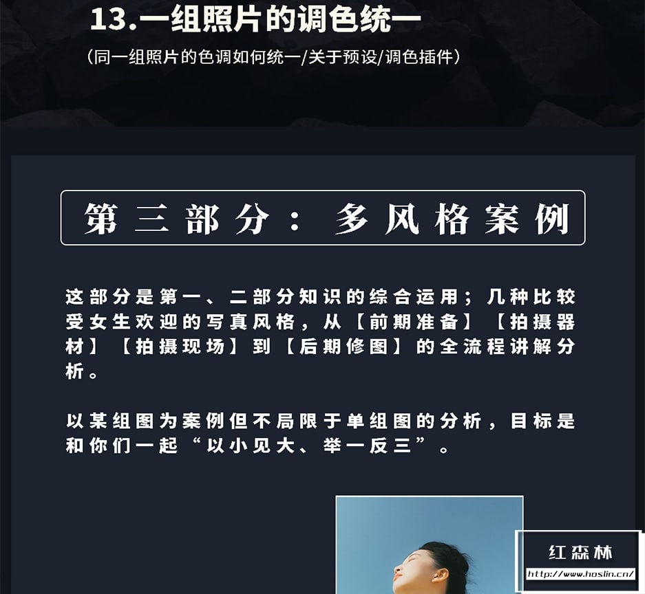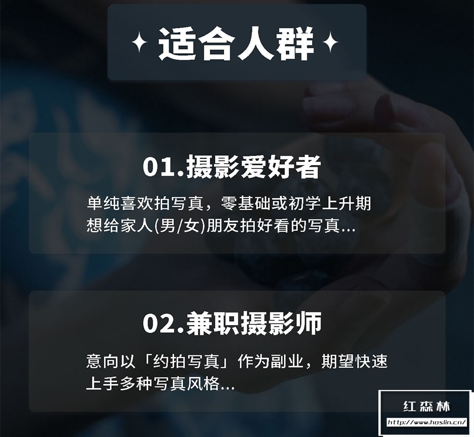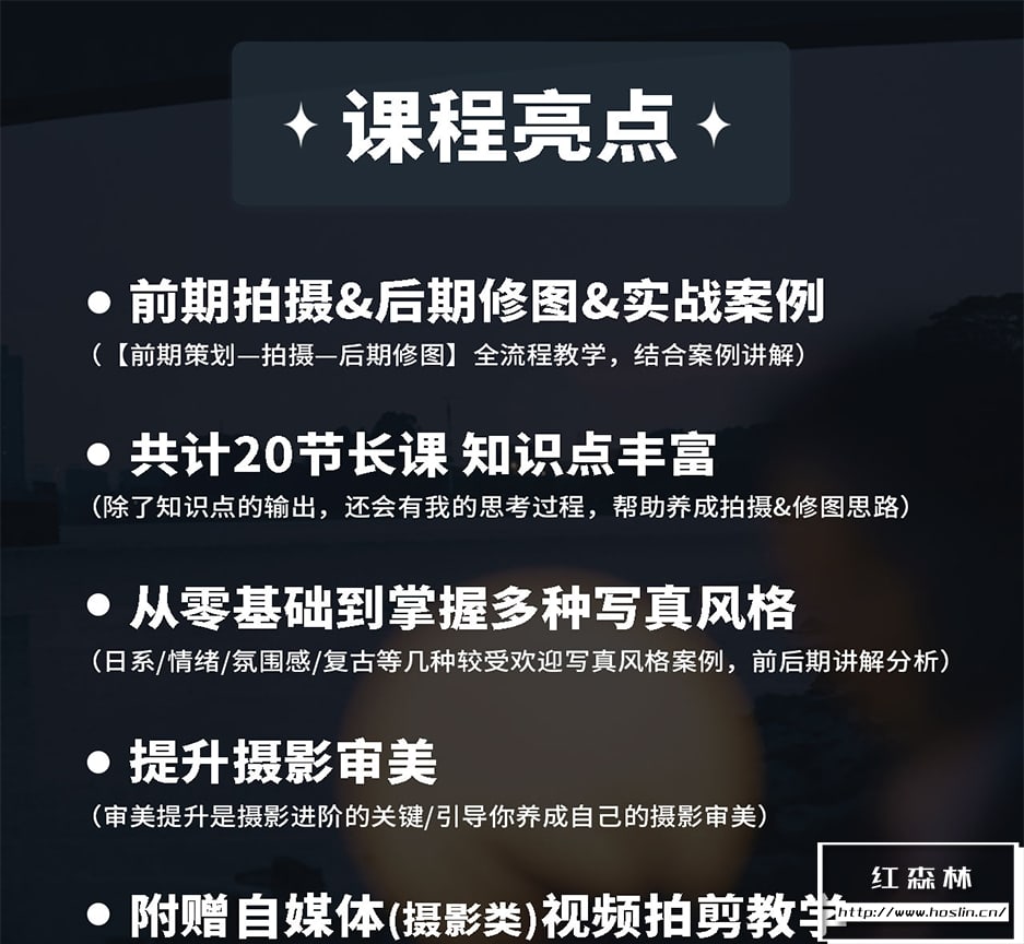 从零基础到掌握多种写真风格,小白也能听懂的人像摄影系统课。内容分为前期拍摄,后期修图和实战案例三大模块,全流程教学,综合案例讲解,攻击20节长课,知识点丰富。真正从零基础到掌握多种写真风格,日系/情绪/氛围感/复古等集中受欢迎的写真案例,提升摄影审美。非常适合各种摄影爱好者,或专业摄影师等广泛人群。文件大小:5.8G含素材