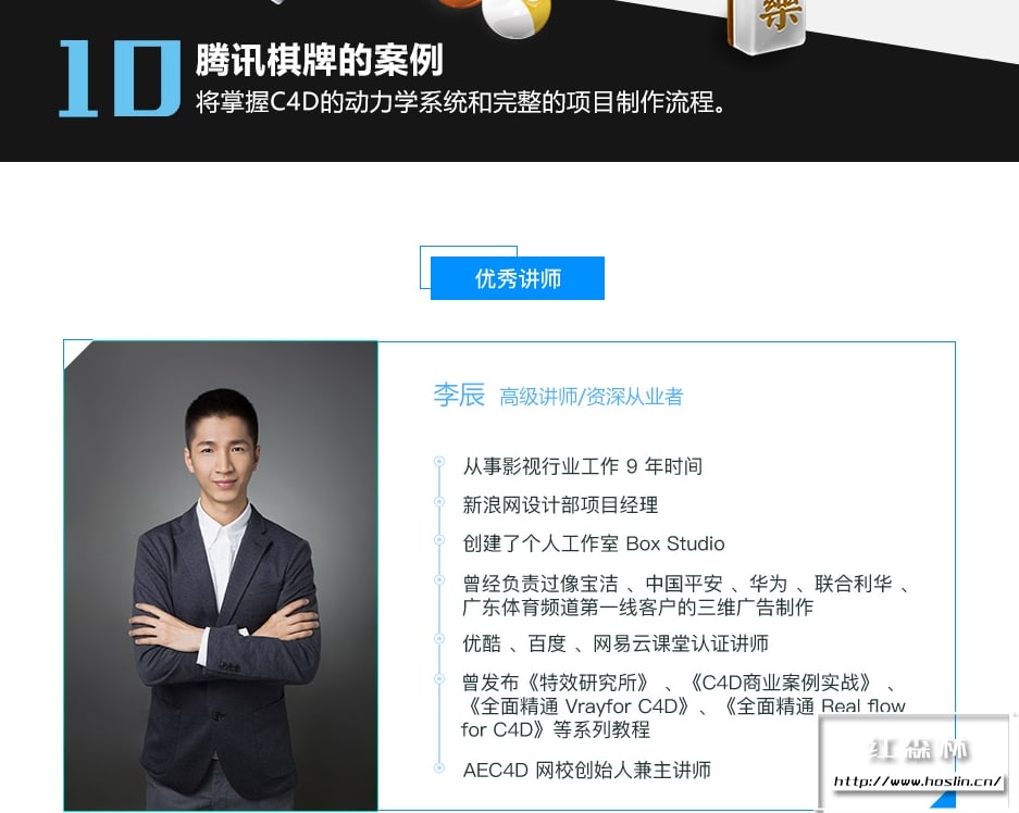 关于老师:李辰从事影视行业工作9年时间,新浪网设计部项目经理, AEC4D网校创始人兼主讲师,创建了个人工作室Box Studio。曾经负责过像宝洁、中国平安、华为、联合利华、广东体育频道等一线客户的三维广告制作,优酷、百度、网易云课堂认证讲师,曾发布《特效研究所》、《C4D商业案例实战》、《全面精通Vray for C4D》、《全面精通Realflow for C4D》等系列教程。