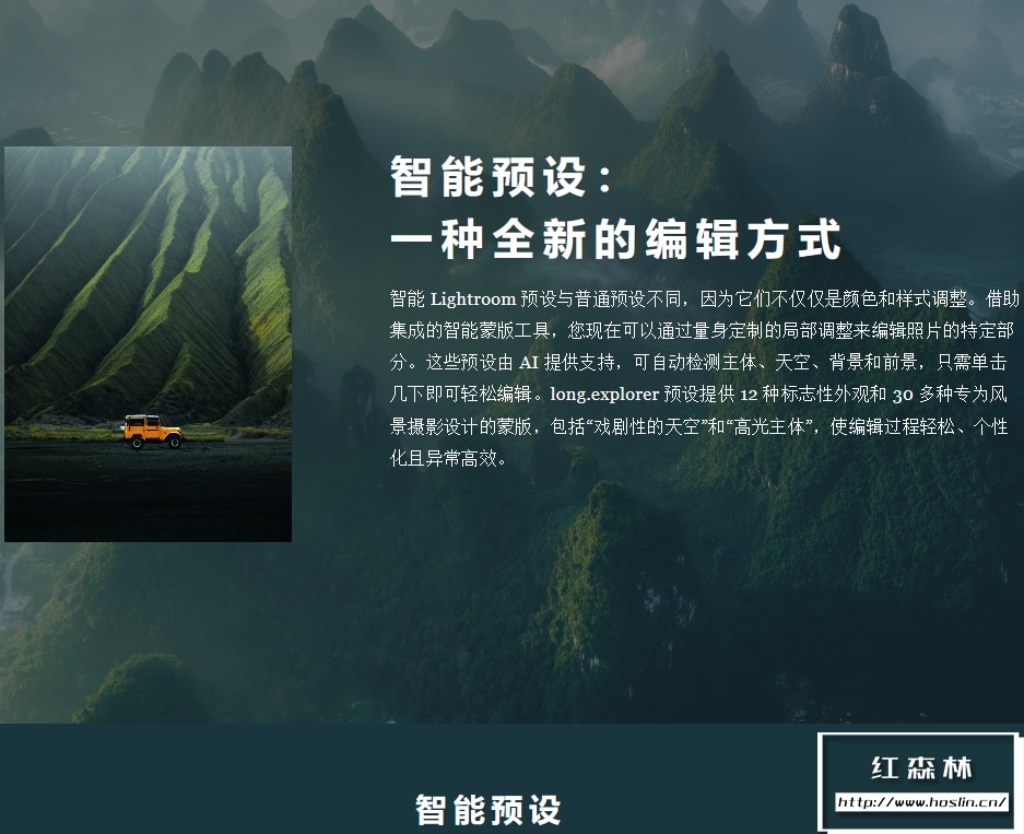 long.explorer Master Collection包含 14 种颜色和风格预设,可为您的风景照片提供独特的外观,适合各种类型的风景,从阿尔卑斯山到茂密的亚洲丛林到非洲沙漠。它还包括34个智能蒙版。这些遮罩利用 AI 主题识别功能,只需单击几下即可帮助您编辑照片的各个方面,包括天空、主要主题、前景和背景。