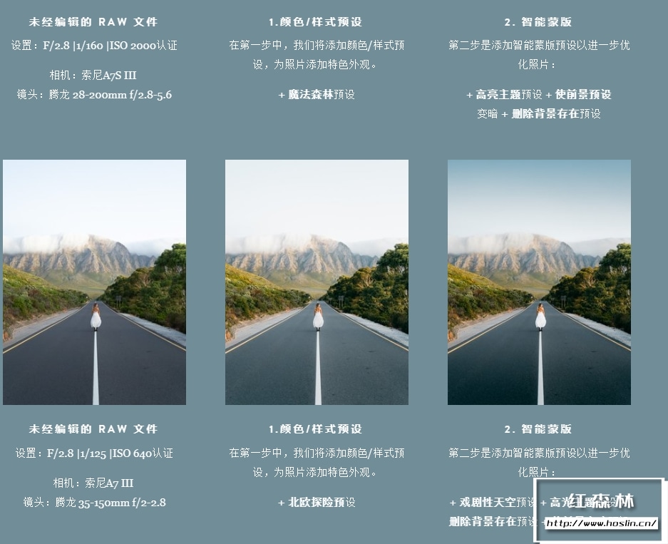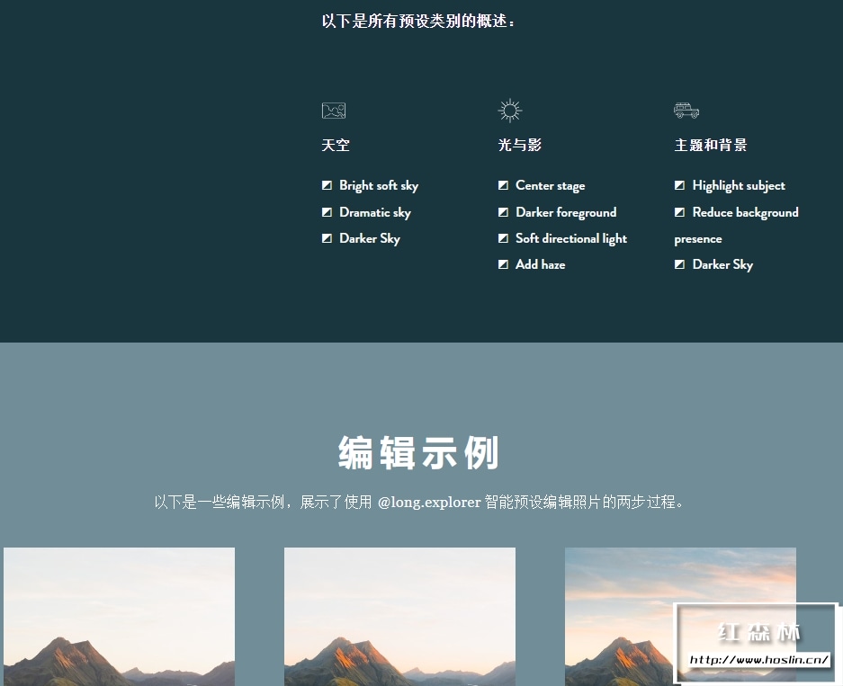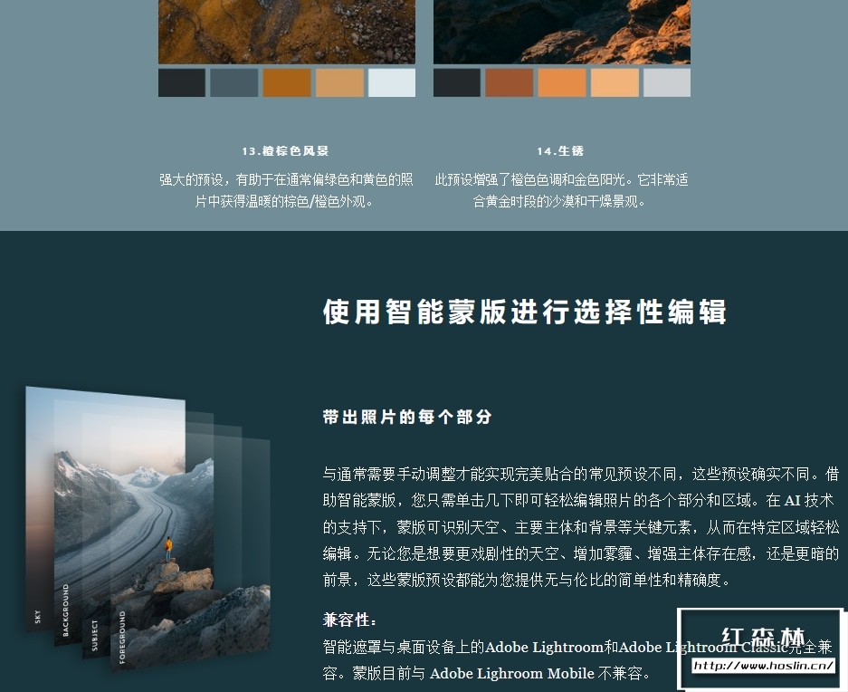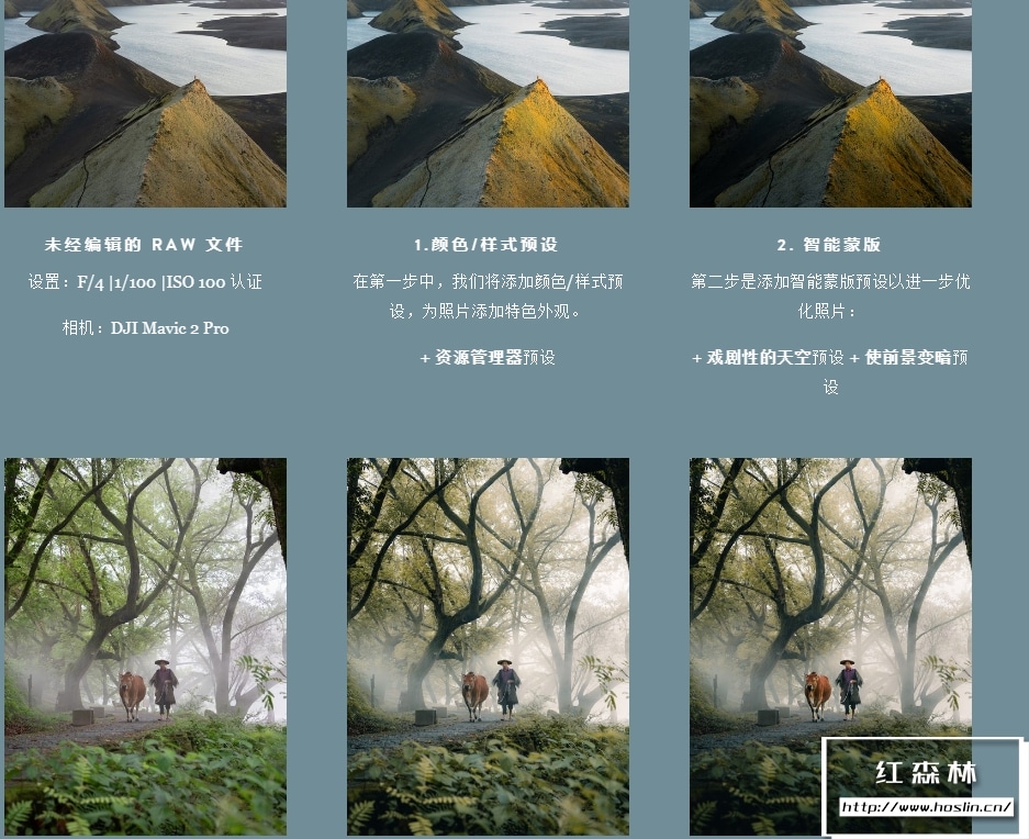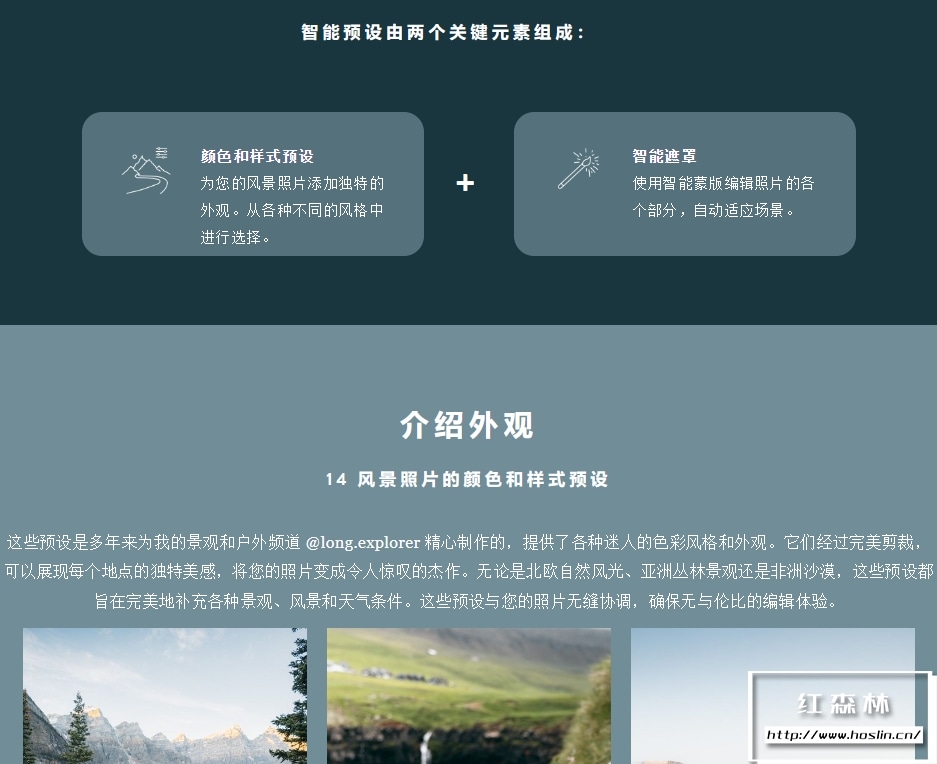 - ✓ 14 个风景预设(适用于桌面端Lightroom/Photoshop;和手机端Lightroom)