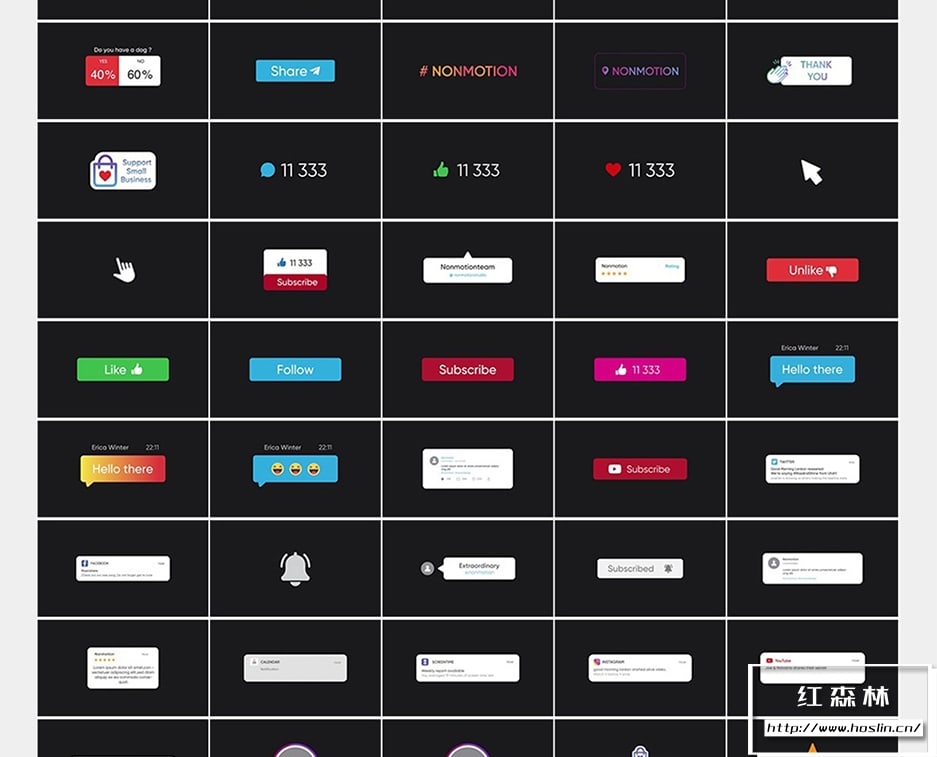 nonmotion graphics library 包含11大类1600多种现代创意视频图形动画元素,如海报背景、表情符号、呼出线条标题、设备动画、LOGO动画、字幕条、循环图形动画等。使用Nonmotion Graphics Library扩展脚本可视化调用,双击即可添加到序列时间线。使用简单,包含视频教程。