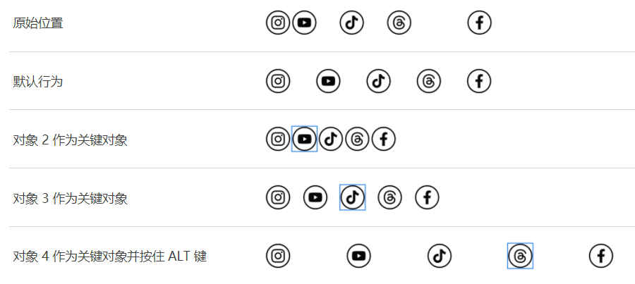 此外,如果您 Alt-单击 / ⌥-单击空格按钮,则将在最右侧的对象和关键对象之间计算分布。