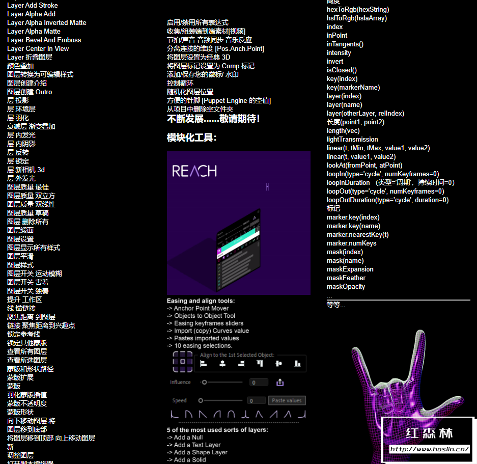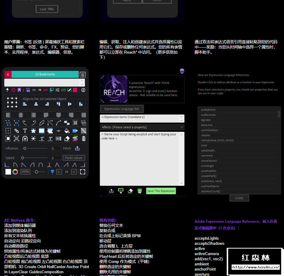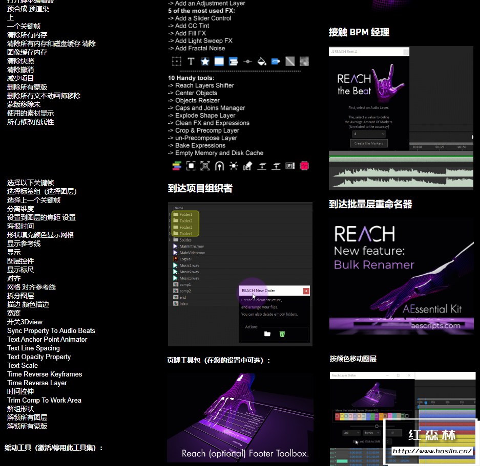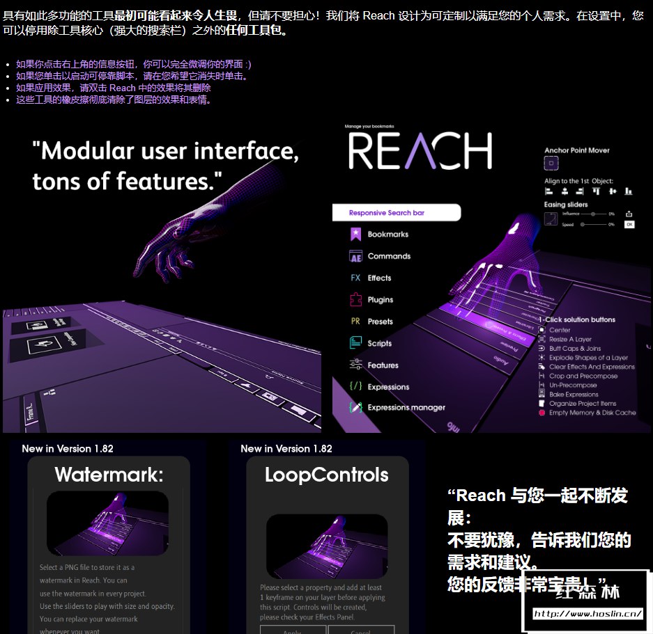 准备好将您的动态设计工作流程带到未知领域了吗? Reach 是一个包罗万象适应性强且不断发展的工具集。它为After Effects工具包注入了一系列独特的 创新实用程序。从 初级到复杂,Reach将期望提升到非凡的境界。通过Reach简化复杂、简化繁琐并激发您的创造力-每个 After Effects 冒险家的典型伴侣。准备好使用 Reach AEssential 工具包提高 After Effects:Reach 使您可以轻松访问AE 中的各种功能,包括命令、效果、预设、扩展、插件和所有脚本。还有预写表达式、表达式编辑器、脚本助手和表达式存储功能。Reach 具有独特的功能,例如 用于管理图层、关键帧、颜色、音频同步、合成、优化、裁剪、反弹、木偶图钉、相机等的工具。 响应式界面还包括内置功能,例如锚点管理器、对齐工具、缓动滑块和快捷方式等。