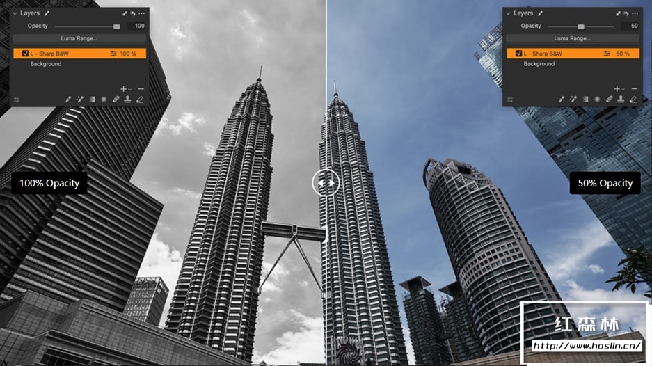 对于黑白风格,不透明度会影响饱和度,从而将颜色带入图像中。因此,调整黑白风格的不透明度以获得半不饱和的外观是有意义的: