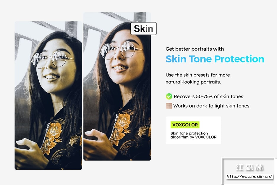 - ✔️ 利用 VOXCOLOR 的肤色保护算法获得自然的效果。