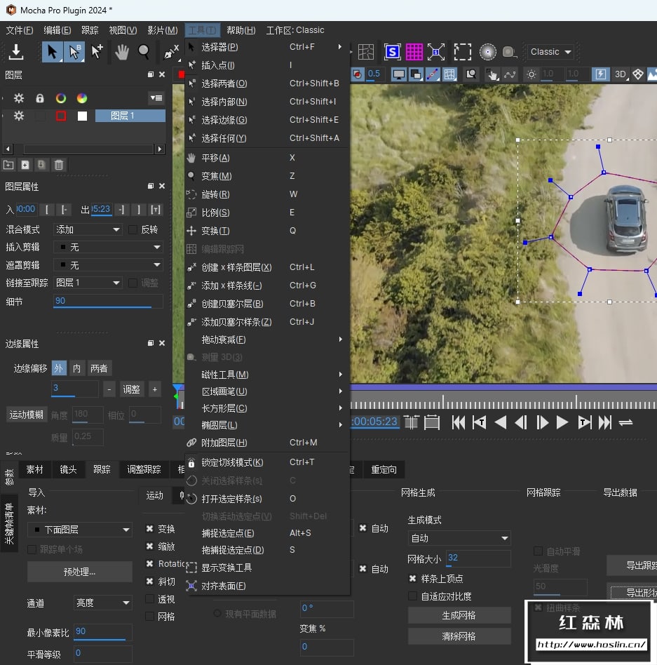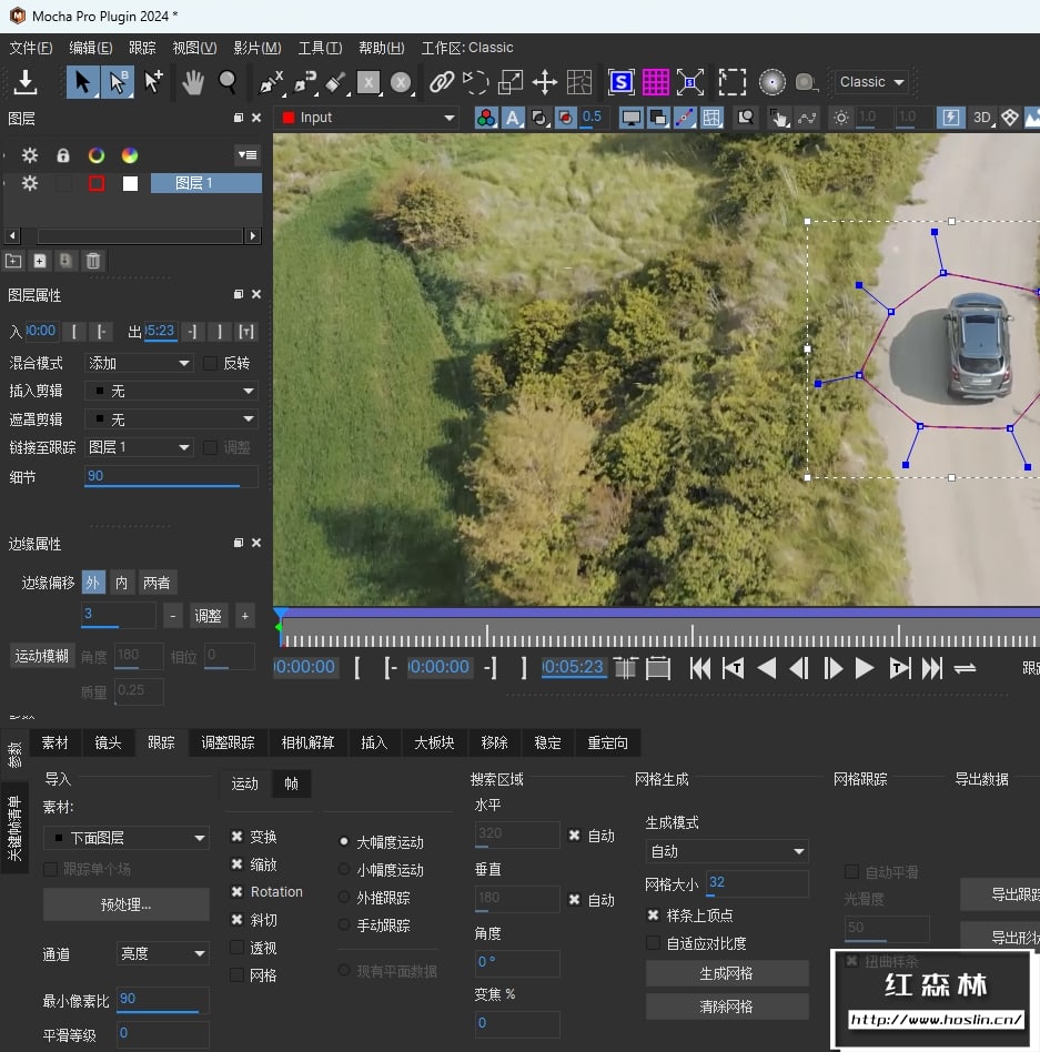 - 使用 Mocha 跟踪进行 3D 求解:可选择使用 Mocha 平面跟踪和 PowerMesh 来协助解决困难问题