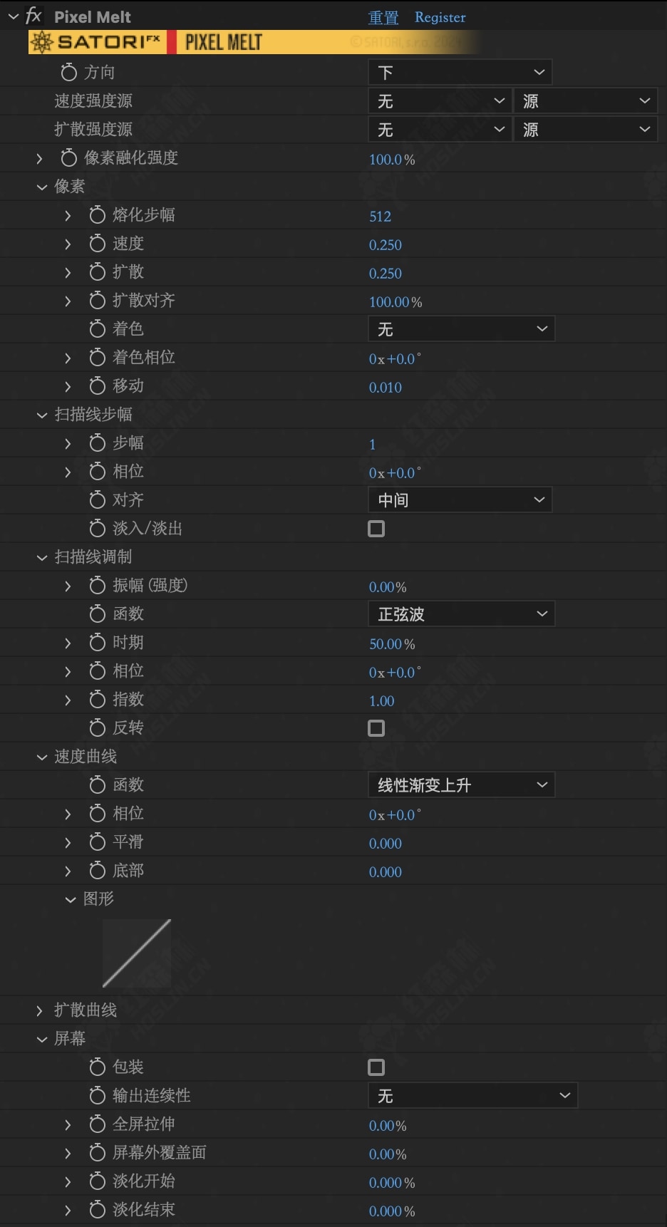 您有一组常用的曲线将像素亮度映射到速度和扩散量。熔化过程是通过设置主强度或熔化步骤参数的动画来实现的。拉伸像素以纯色或附加阴影绘制。