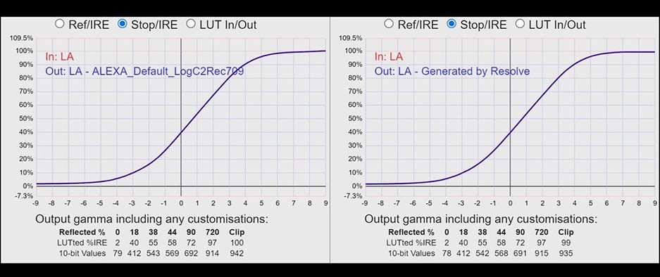 2 个摄像头的匹配伽玛曲线(左侧的 Alexa709 LUT 和右侧的 Phantom Neutral LUT)可实现相同的对比度和曝光值,甚至低至 10 位值。